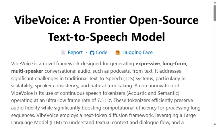 VibeVoice 是一系列前沿的开源语音 AI 模型,包含语音合成(TTS)与语音识别(ASR)两大核心功能。该项目旨在推动语音技术领域的开放协作,提供支持长音频处理、多语言、多说话人及实时流式生成的高性能模型,方便开发者集成与应用。