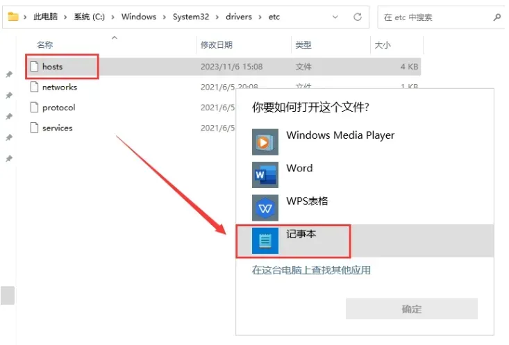 打开 C 盘,找到路径:`Windows\System32\drivers\etc`,选择 hosts 文件,右键选择打开方式 – 记事本打开。如果没有 hosts 文件,请自行查找方法新建一个。