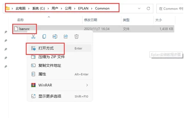 打开 C 盘,找到路径:`Users\Public\EPLAN\Common`,选择用记事本打开 `lservrc` 文件。