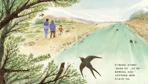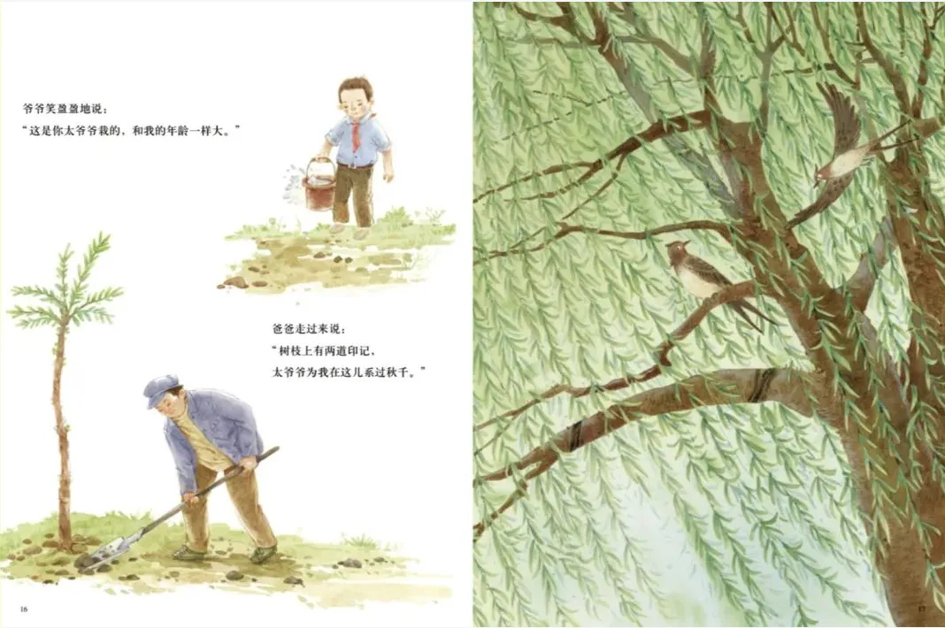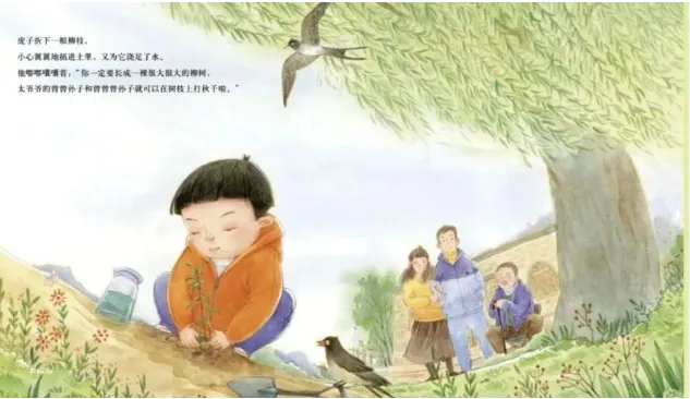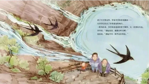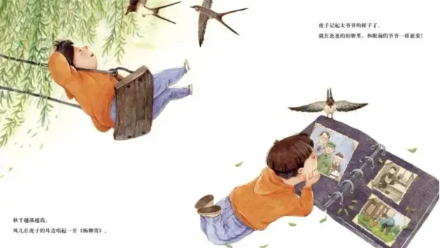 在故事中,虎子通过触摸太爷爷种下的柳树、荡太爷爷系过的秋千、制作柳环、放风筝等经历,逐渐理解到:太爷爷虽已离世,看似遥远,却通过血脉传承、家族记忆和生活痕迹,与家人紧密相连。例如,柳树的生长、秋千的痕迹、风筝的飞翔,都成为连接过去与现在的纽带,让虎子感受到太爷爷的存在并未消失,而是以另一种方式陪伴着他们。