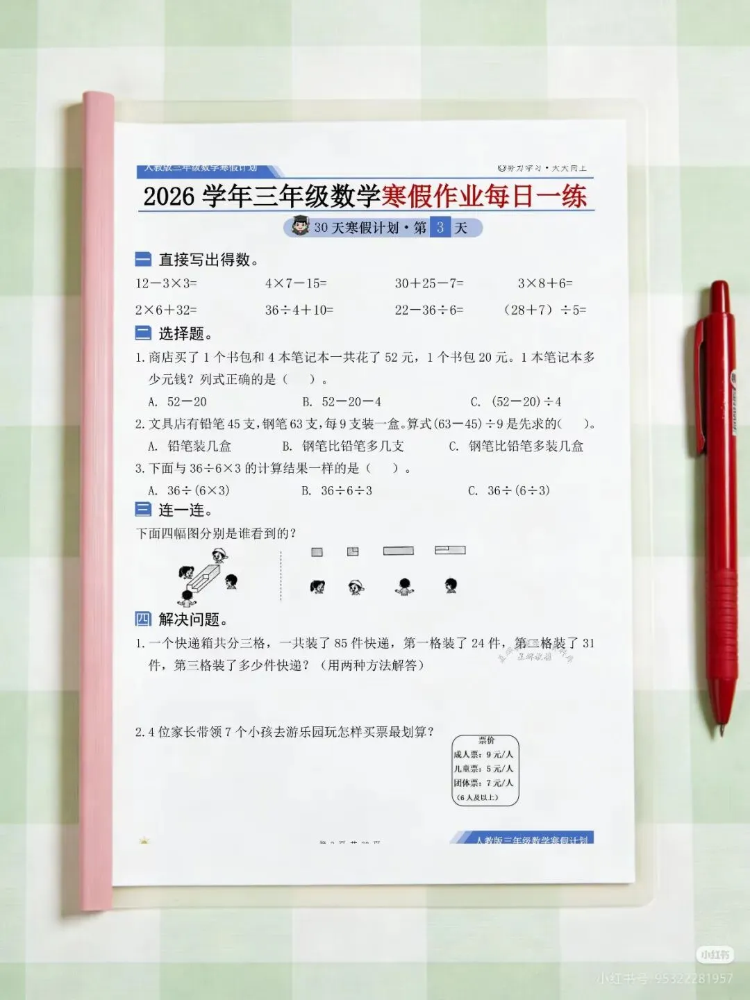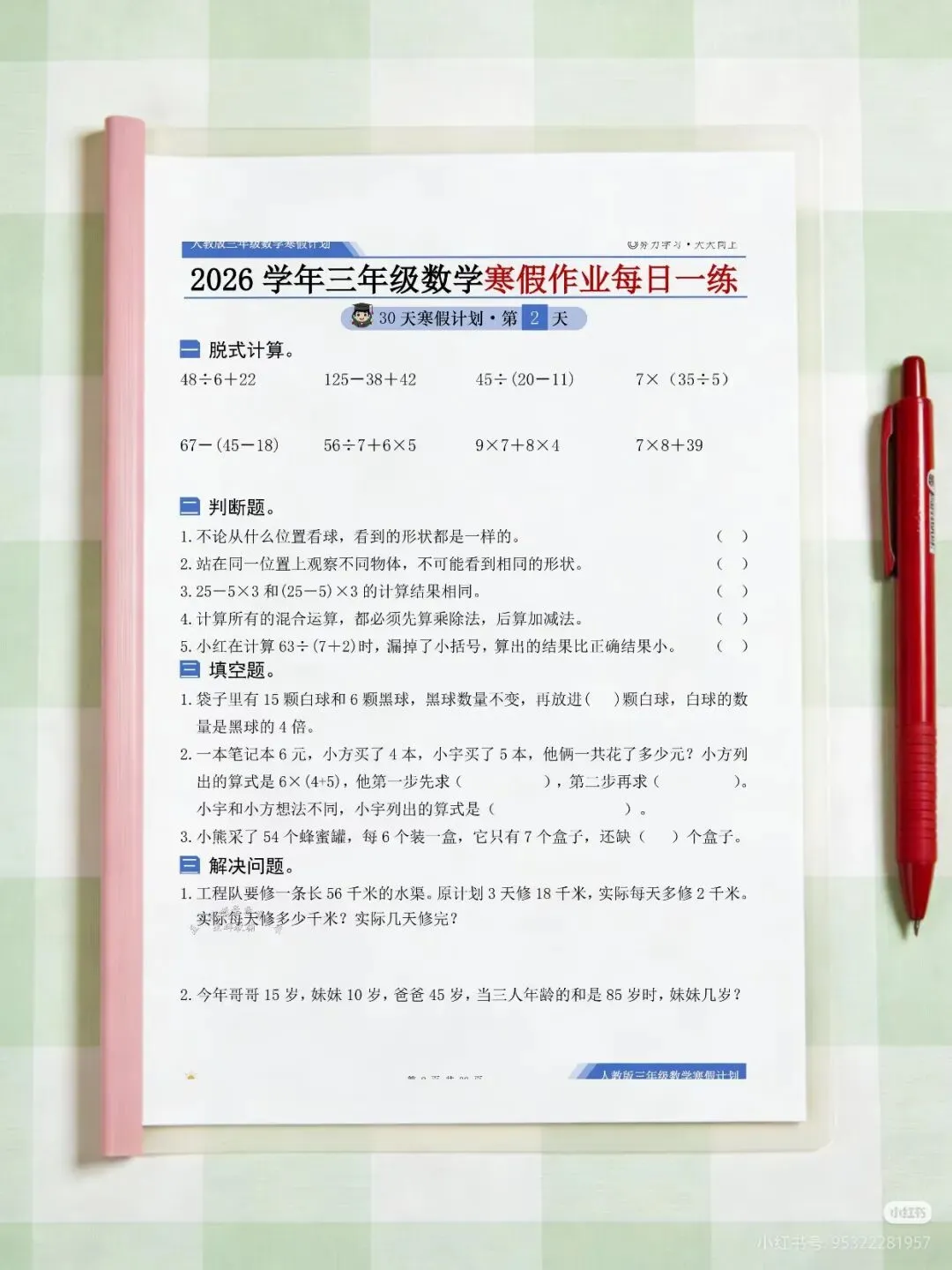 寒假一到,孩子数学就“放羊”?计算粗心、应用题读不懂,开学直接掉队!别急,这份老师内部都在用的《寒假每日一练》来救场了,每天15分钟,轻松巩固上册知识,为下学期打好基础!