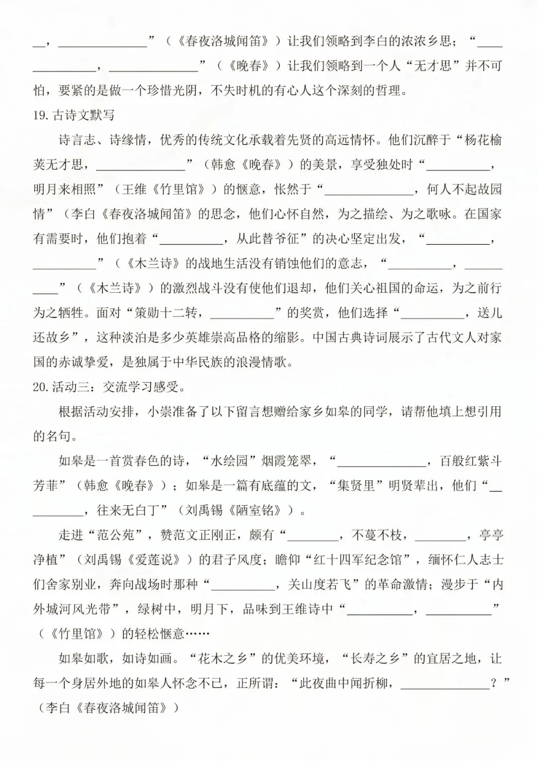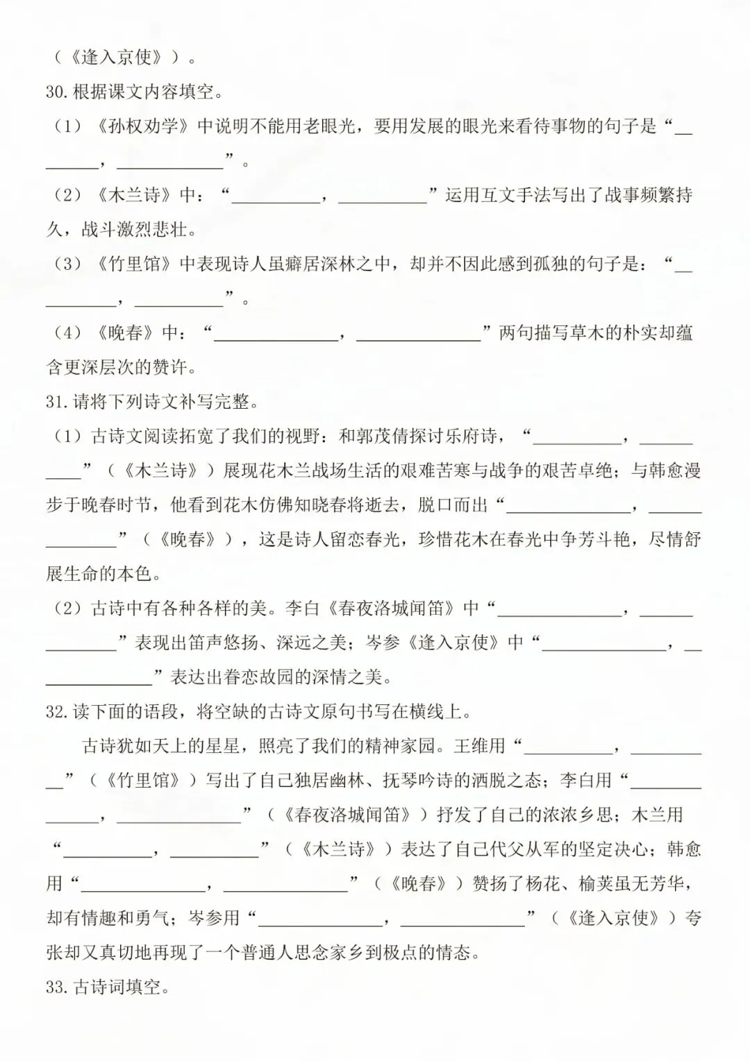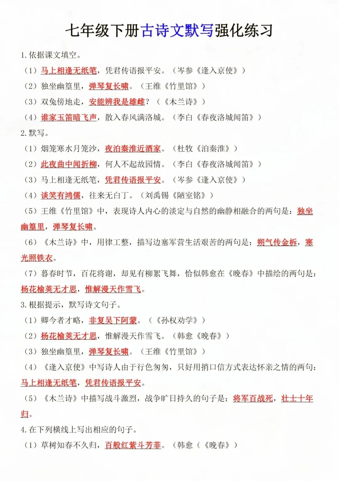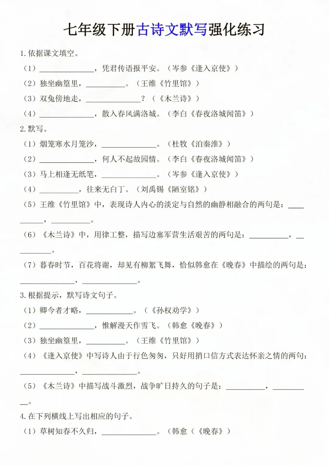 老师为大家整理好了资料:七年级下册语文古诗文默写强化练习 电子版可打印!
