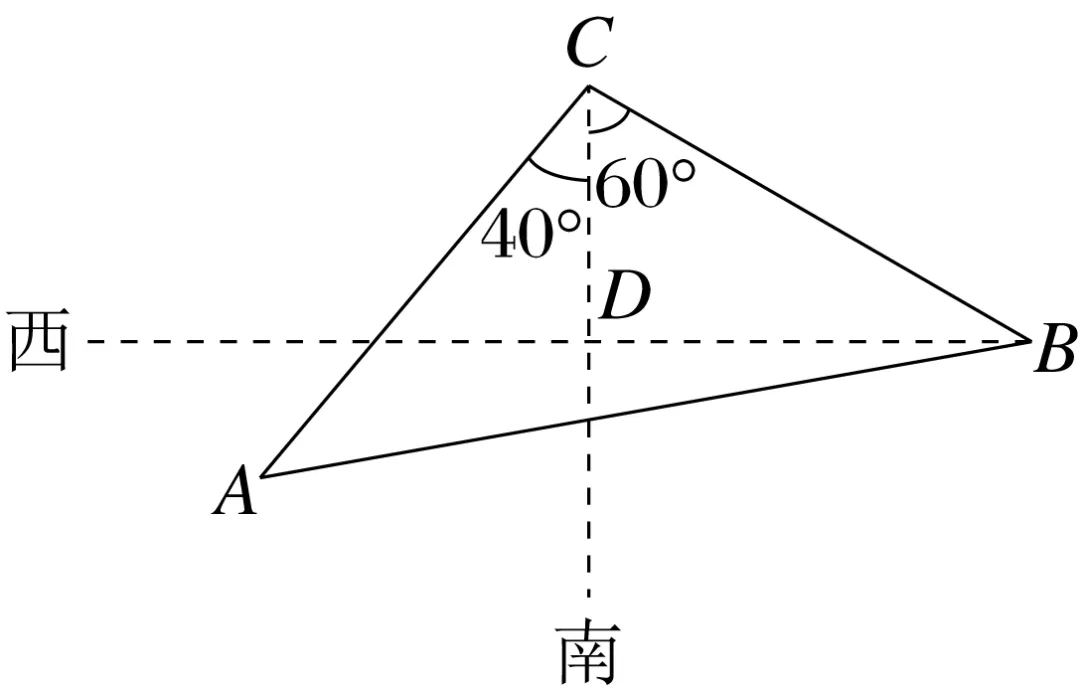 解析:由条件及题图可知,△ABC为等腰三角形,所以∠BAC=∠ABC=40°,又∠BCD=60°,所以∠CBD=30°,所以∠DBA=10°,因此灯塔A在灯塔B的南偏西80°方向上.故选D.