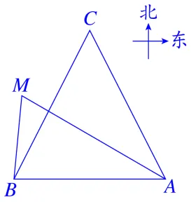 【例1】(2024·山东临沂一模)在同一平面上有相距14千米的A,B两座炮台,A在B的正东方.某次演习时,A向北偏西π2-θ方向发射炮弹,B向北偏东π2-θ方向发射炮弹,其中θ为锐角,观测回报两炮弹皆命中18千米外的同一目标,接着A改向向北偏西π2-θ2方向发射炮弹,弹着点为18千米外的点M,则B炮台与弹着点M的距离为( D )