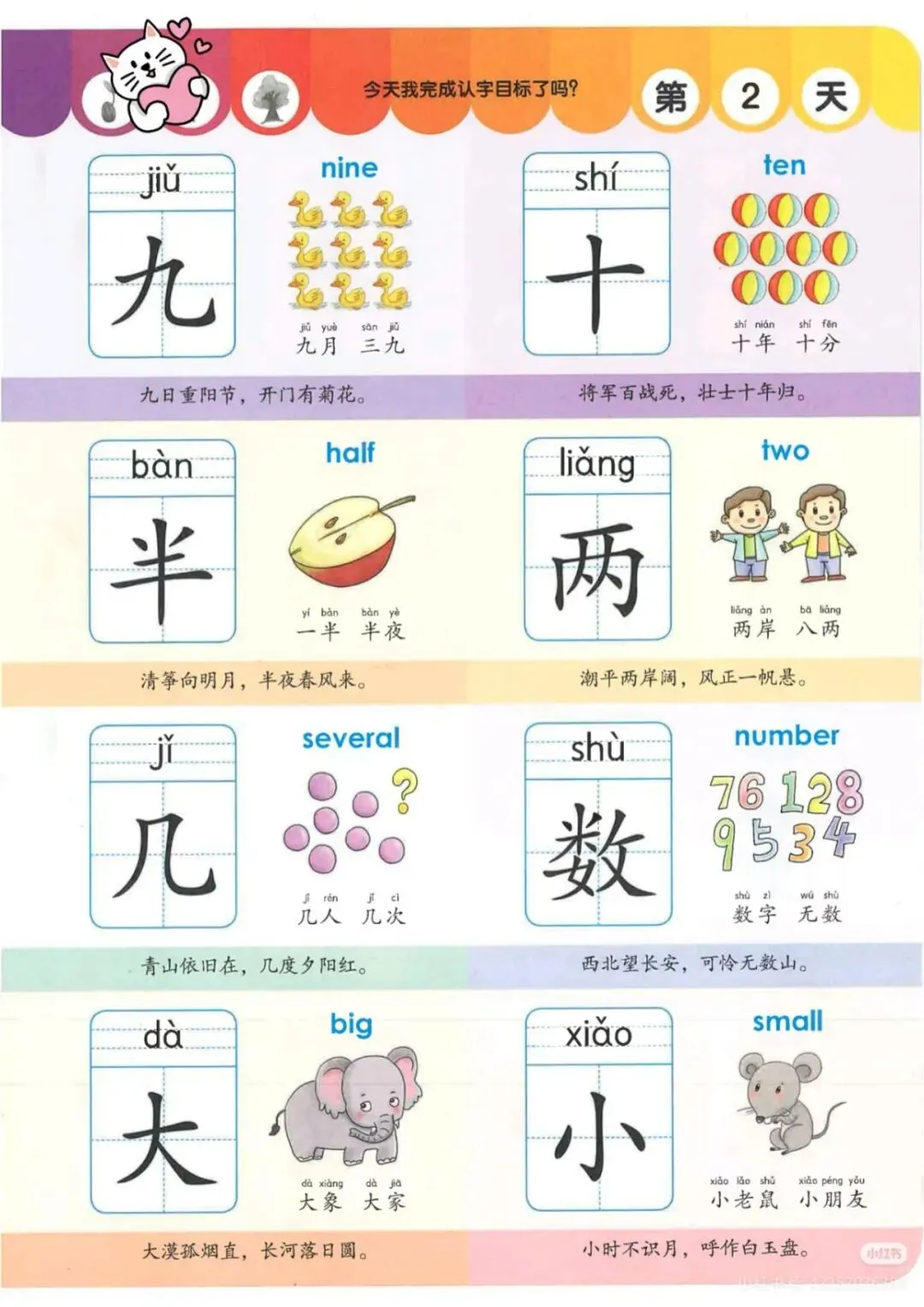 每个汉字均配备拼音、英文、趣味插图和诗词例句,图文结合,记忆更牢。 -