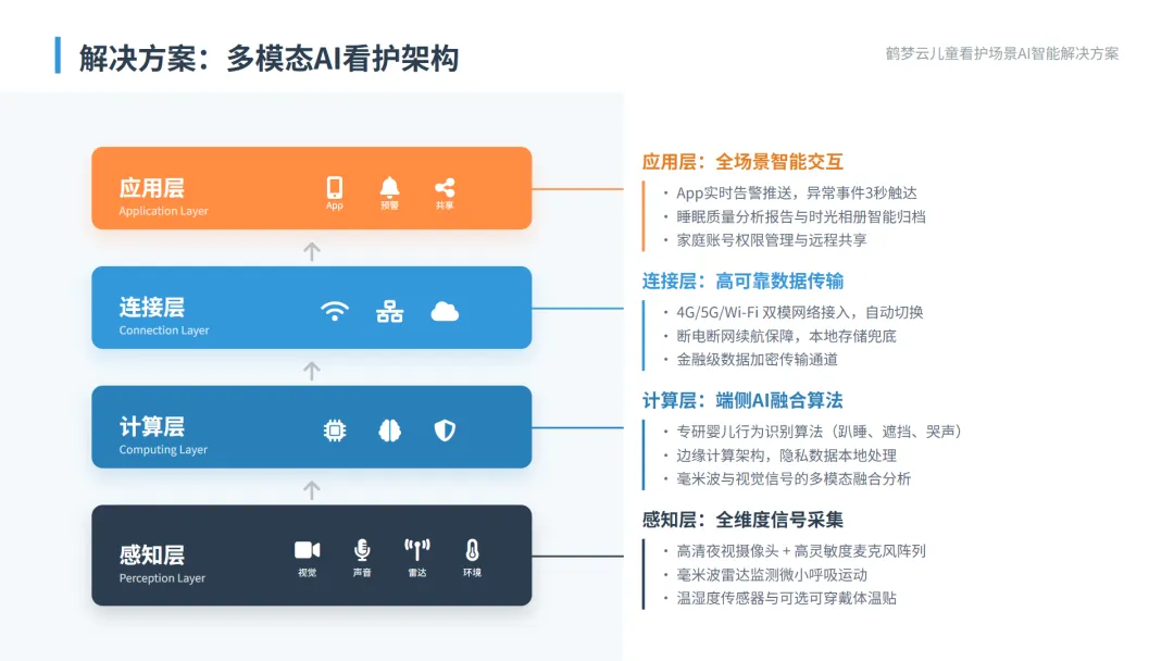 鹤梦云儿童安全智能解决方案采用多模态婴幼儿看护架构,将视觉、声音、雷达、环境感知信号统一接入,由端侧AI算法完成实时分析,逐一击破上述核心焦虑。