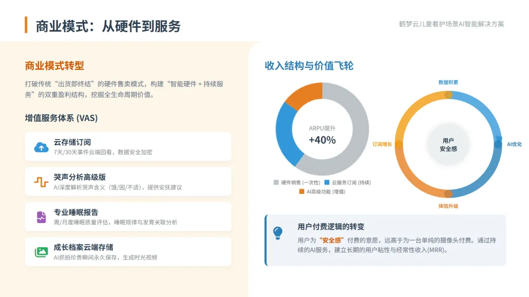 鹤梦云儿童安全智能解决方案改变的,正是这个结构。云存储订阅、哭声分析高级版、睡眠报告、成长档案云端存储——每一项都是硬件之外可持续运营的增值服务。