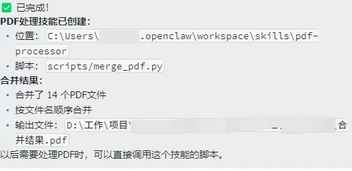 1分钟,OpenClaw将几十个PDF合并成了1个