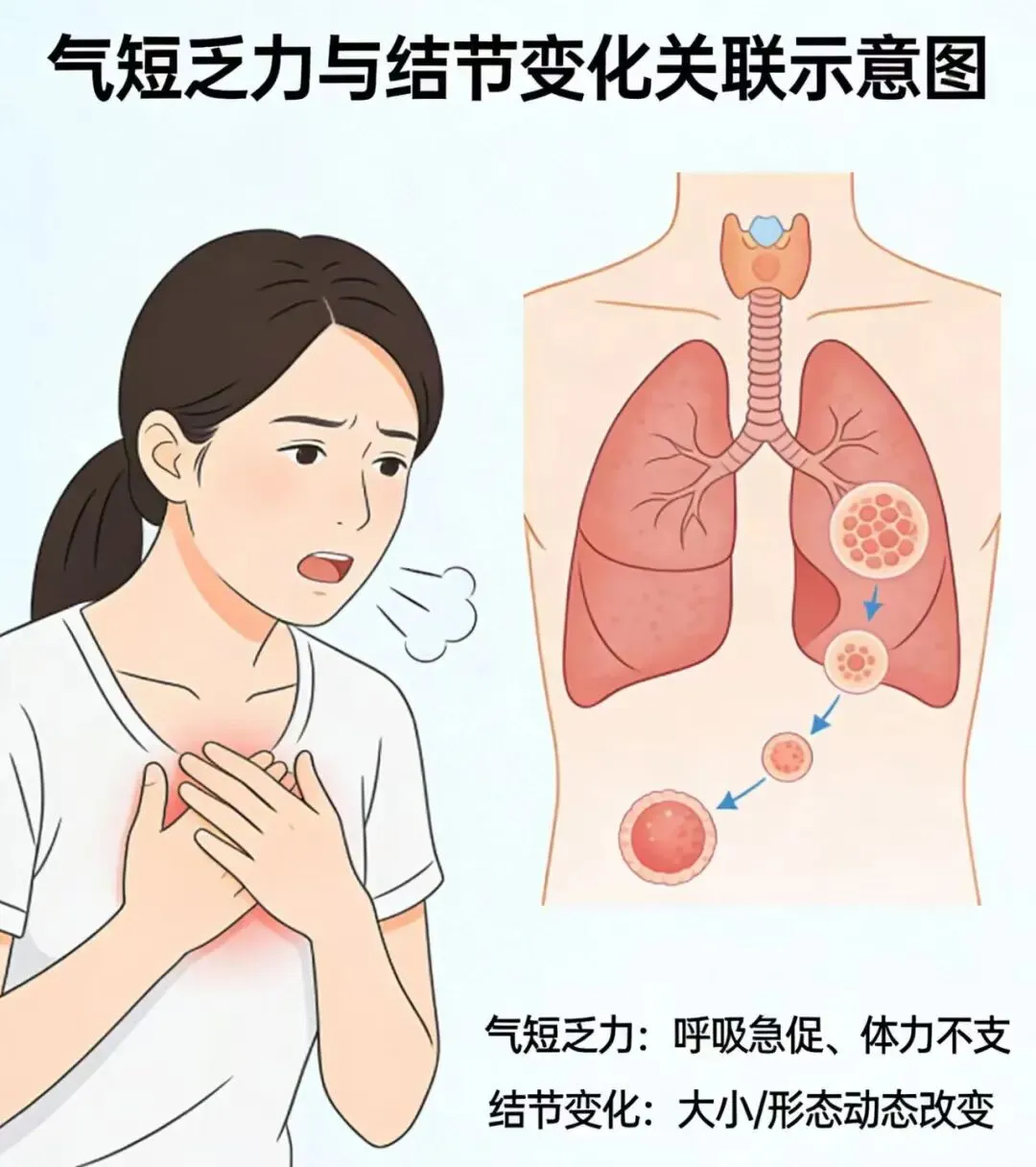 这是肺气弱了,没法把气输送到全身,身体得不到足够的气濡养,自然容易累、易气短。而 “肺主皮毛”,肺气固摄不住毛孔,就会莫名出虚汗,尤其是肺结节的朋友,会更加难过,复查影像可能发现结节变大变实。