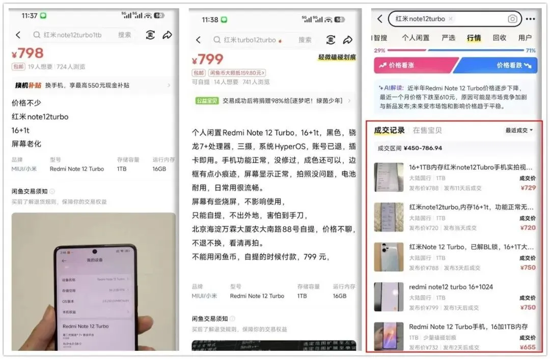 这两年手机存储这块变了个样,两年前上游芯片厂供货价往下走一段时间没停过,整条线的价格一路往底下压,24G+1TB这种大存储的新机三千出头就能拿下,1TB固态新货也见过199的价,大家都在说大存储会越来越普及,手机标配就得上去,现在看二手里要找能买到的最便宜1TB安卓,直接指向红米Note12 Turbo,这台老中端在这一波涨价里被人当成捡漏位。