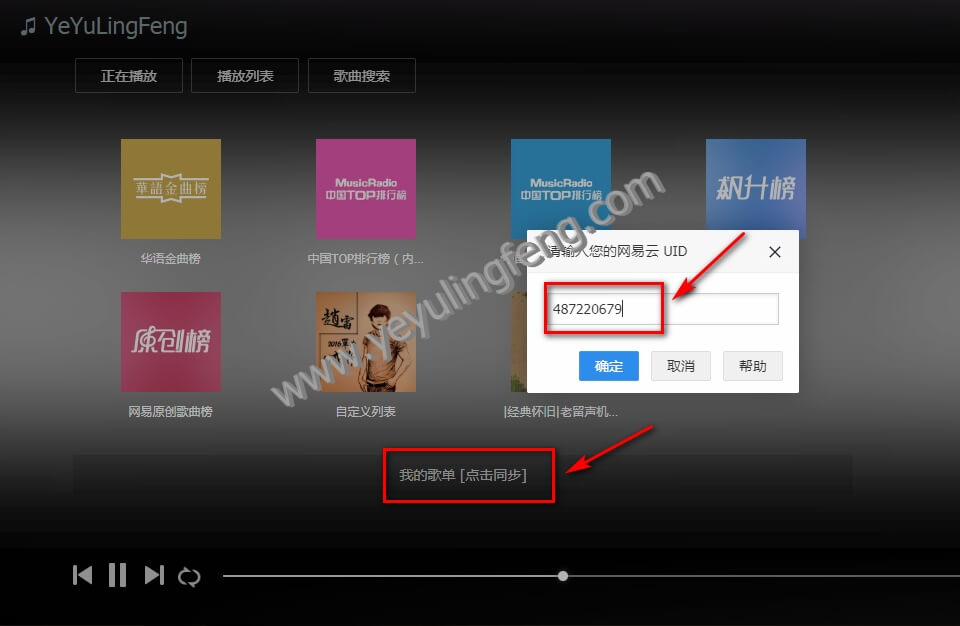这里老夜分享的是自己的分享链接,链接后面的rid就是用户识别码,每个人的rid均是不一致的,大家只需要将最后面的数字复制保存。然后我们打开听歌房站点,点击顶部播放列表,然后拖到最下方,找到“点击同步”,将刚才保存好的rid码复制点击确认后就能直接读取网易云中收藏的歌单了,通过rid用户标识码无需输入账户密码不会造成账号异常,大家可以放心使用。