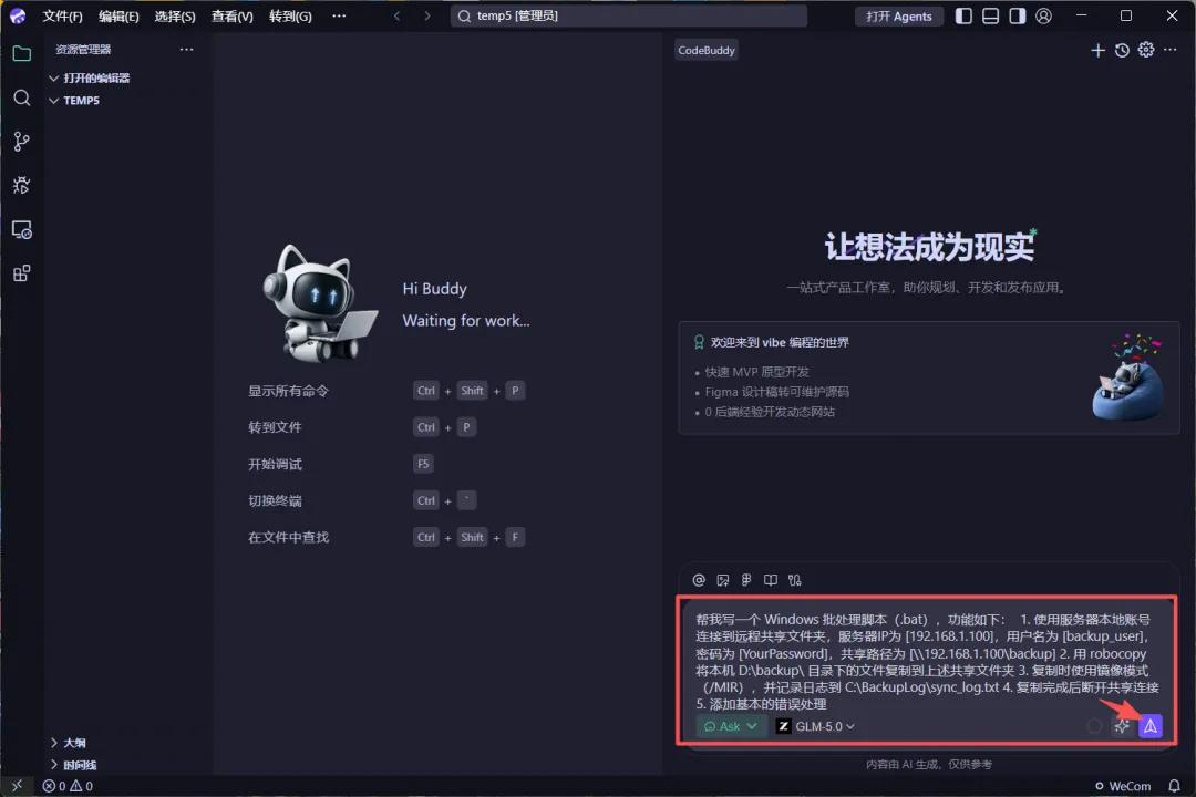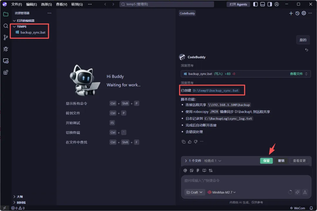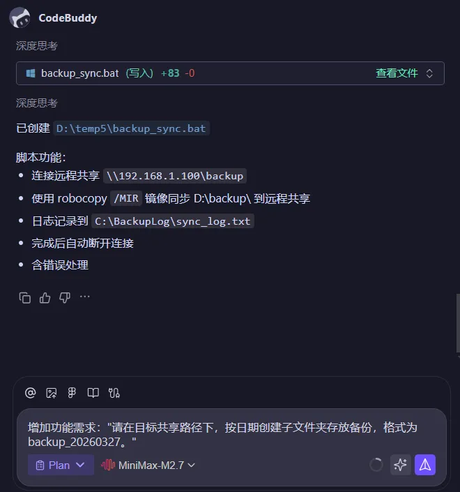 CodeBuddy 会分析你的需求,生成一个完整的批处理脚本。生成结果大致如下: