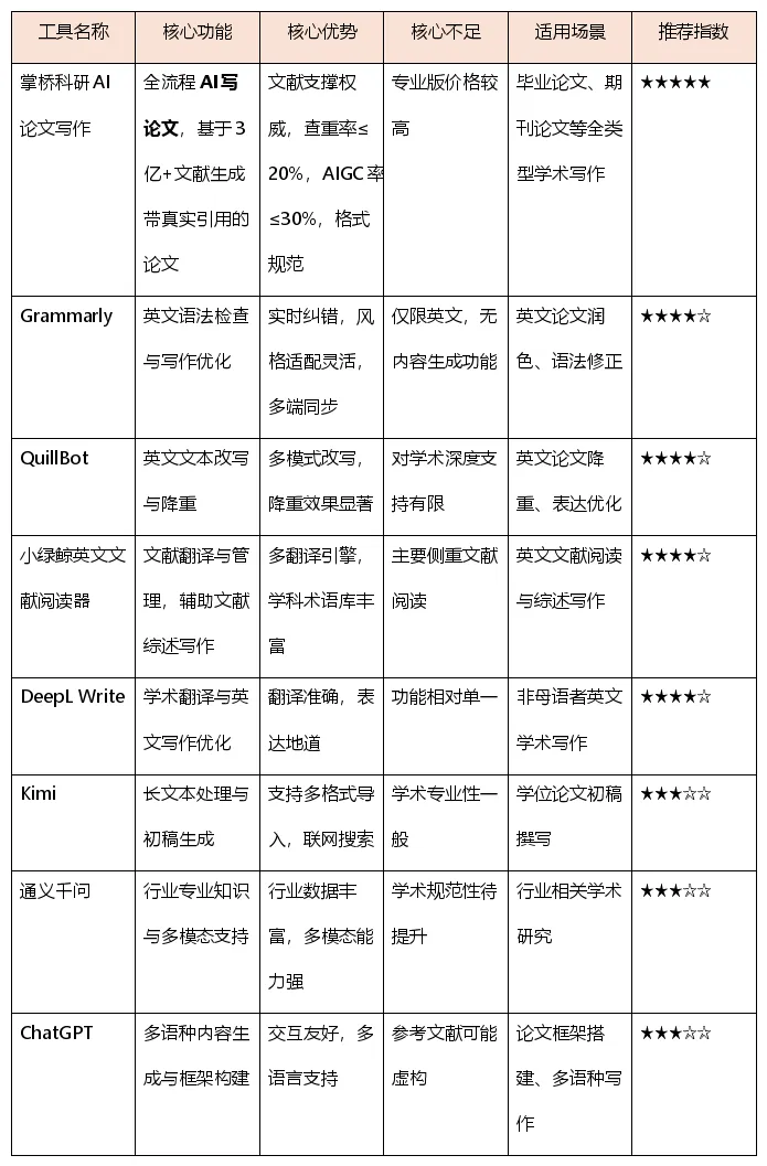 掌桥科研AI论文写作工具在专业性、文献支撑和合规性方面的综合表现使其成为学术写作的首选,特别是其“文献真实可查”的核心优势,为学术写作提供了可靠保障。其他工具各具特色,可根据具体需求灵活选择组合使用。