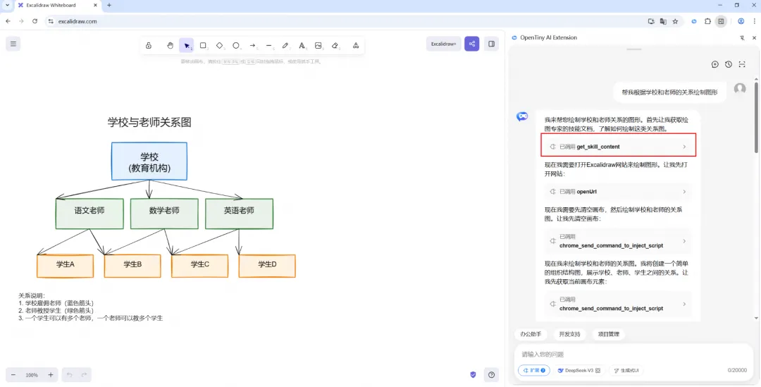 在 skills 目录下放一个 SKILL.md 文件,写上角色定义和行为规则,AI 就能自动识别用户意图并以对应专家身份响应。内置的「画图专家」已经能操作 Excalidraw 绘制专业架构图——无需任何手动触发。