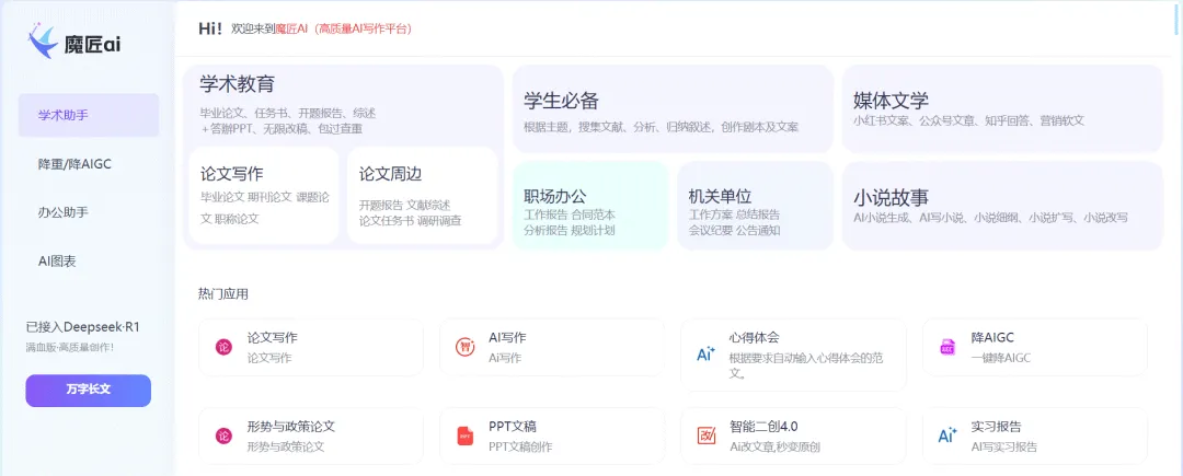 魔匠AI是一个专业学术平台,专为AI论文写作而精心设计。它从论文的选题阶段开始,一直到最后的答辩环节,都能全程支撑AI写论文。这意味着在整个论文创作的漫长过程中,魔匠AI都能为AI论文生成提供有力的保障,让AI写论文变得更加顺畅。