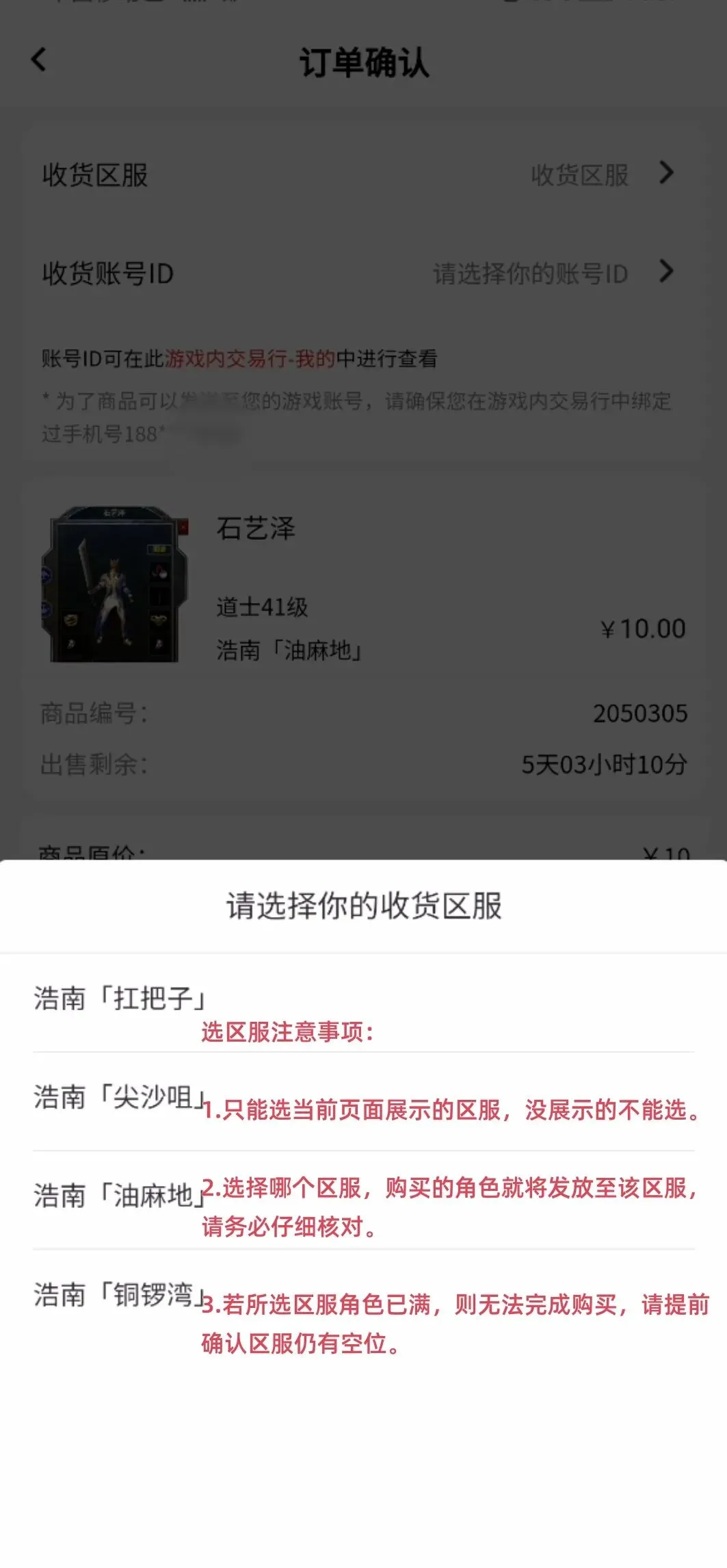 填完区服之后,我们再次确认角色、价格、区服、收货ID无误后,点击 「下单」 并完成支付。