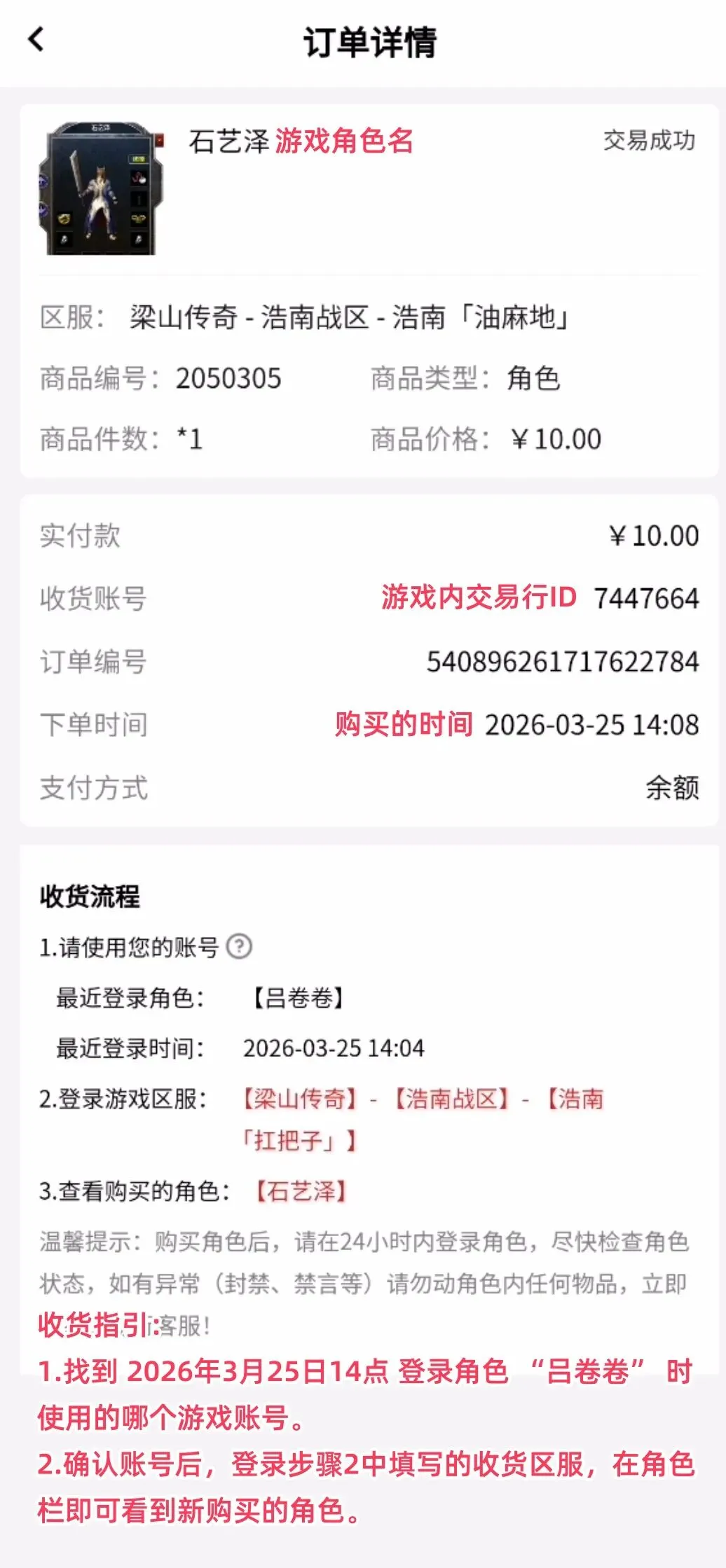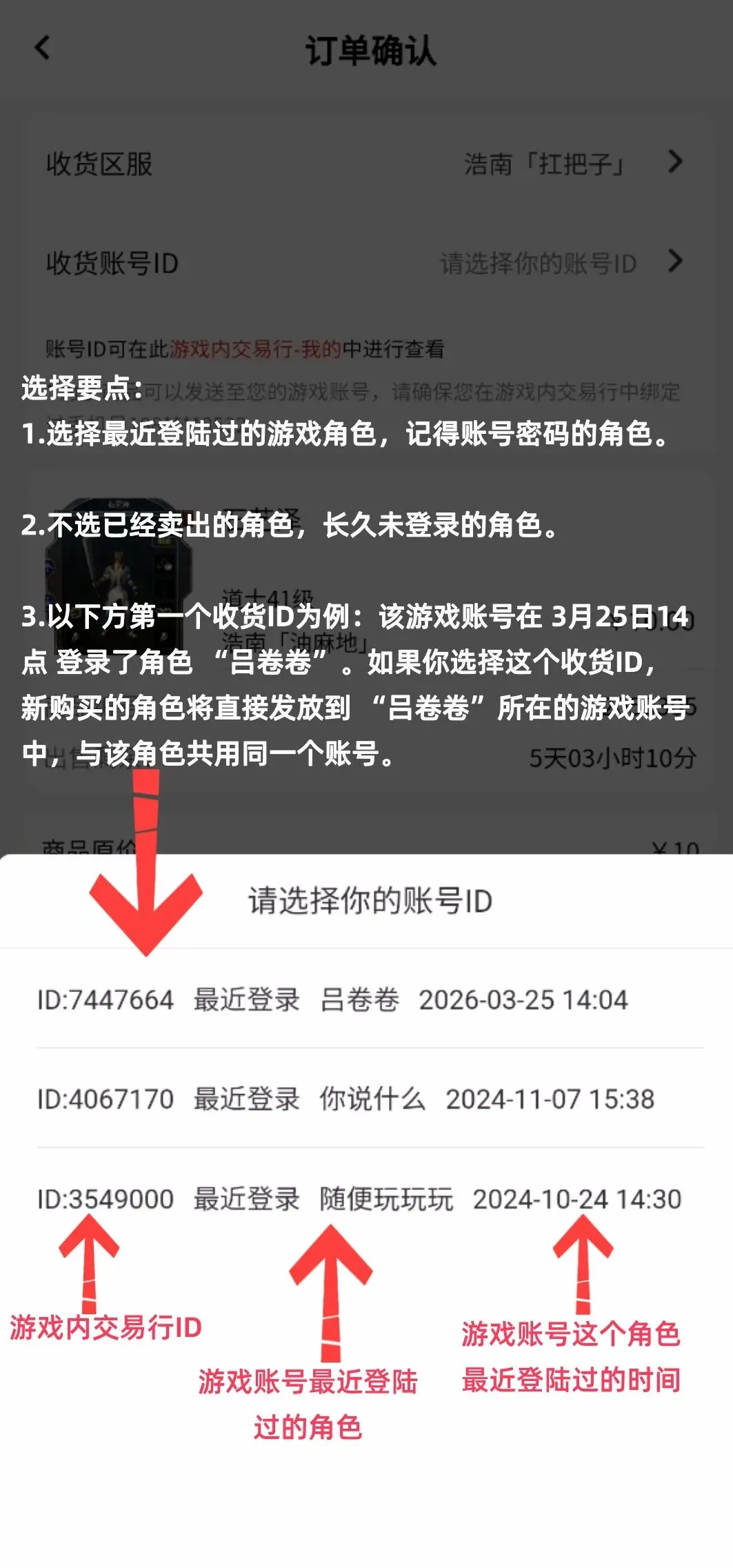 3.以下方第一个收货ID为例:该游戏账号在3月25日14点 登录了角色 “吕卷卷”。如果你选择这个收货ID,新购买的角色将直接发放到 “吕卷卷”所在的游戏账号中,与该角色共用同一个游戏账号。