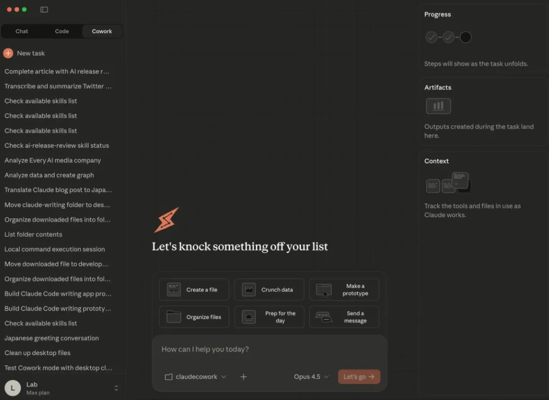 2026年1月12日,Cowork上线。作为一个内置在Claude桌面端的Agent工作区,当用户指定一个本地文件夹,Claude在里面读写文件、整理资料、生成文档,后来的Minimax和腾讯的Workbuddy很快进行了能力跟随。