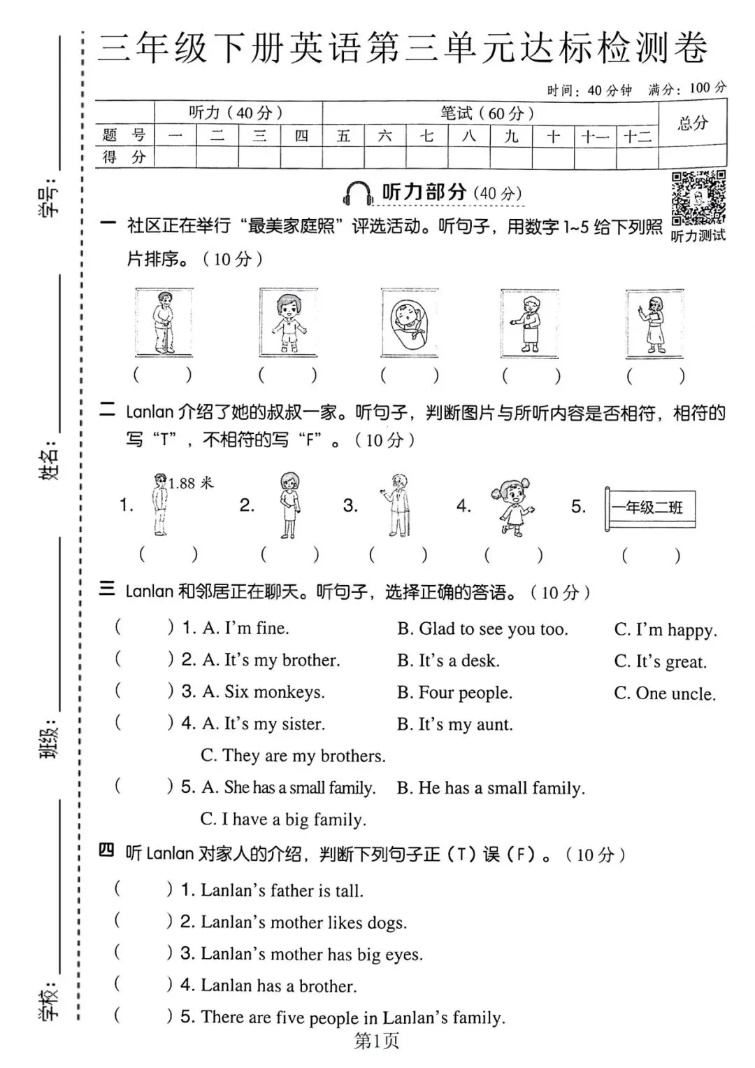 2026春 人教PEP版 三年级下册英语【第三单元测试卷】电子版可下载打印!