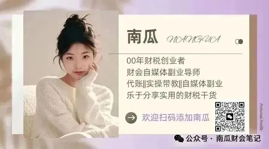 我是 南瓜(微信号:xn52699),一个从代账会计到财务自媒体的 00 后女孩,专注分享 新手会计成长路径 + 财务干货 + 自媒体实战经验,陪你一起在财务路上越走越稳。