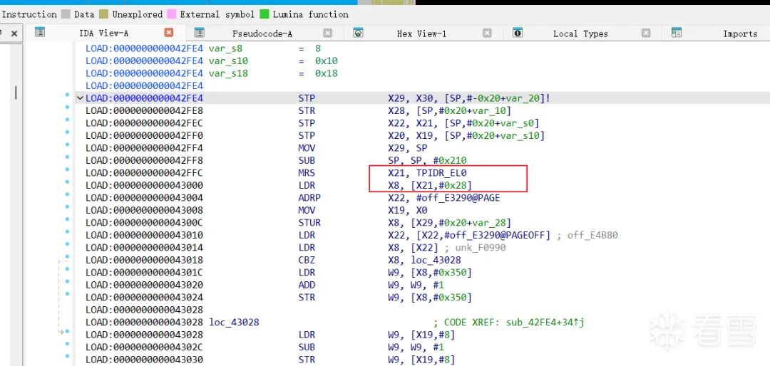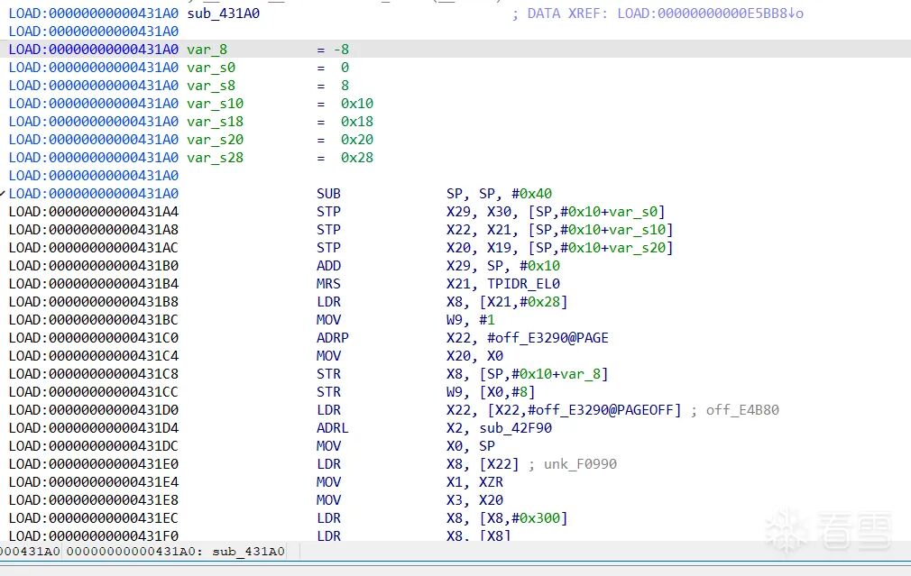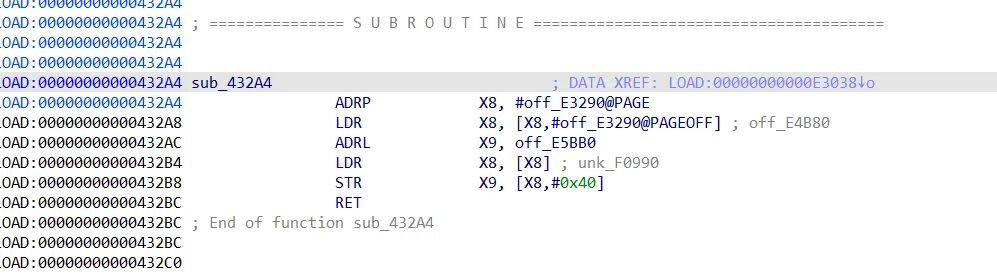 这里先是LDR 读取 off_E3290的所在内存页偏移(就是拿到off_E3290)的地址到x8
