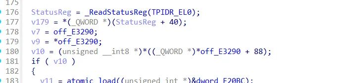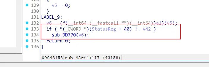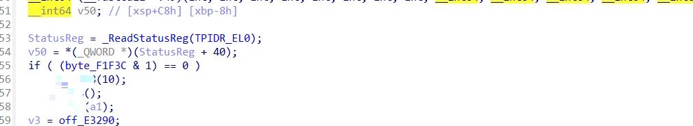 可以发现这里调用了TPIDR_EL0 后续又做了校验 ,有反调试嫌疑,继续跟进。发现末尾做了标志位校验,如果监测到异常,直接跳入死亡函数分支,如果没有,函数ret0 sub_dd770是一个跳板函数,跳入一个偏移,偏移是自杀函数。
