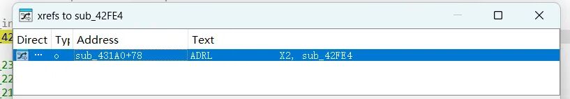 这里其实我已经确定是一个检测函数了 ,为什么呢,要归于我之前的判断。首先,开头if(*off_E3290)很重要,这个极有可能是一个检测防护结构体的地址,是一个二级指针,为什么这样说呢,我们对刚刚分析的偏移0x42FE4分析看看,我们一直对这个函数链交叉引用。