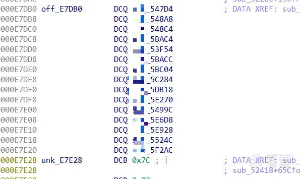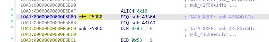 所以我们现在来看看到底放了什么东西吧,先看off_E5BB0 这里也就是刚刚函数432A4加入E3290的偏移地址。