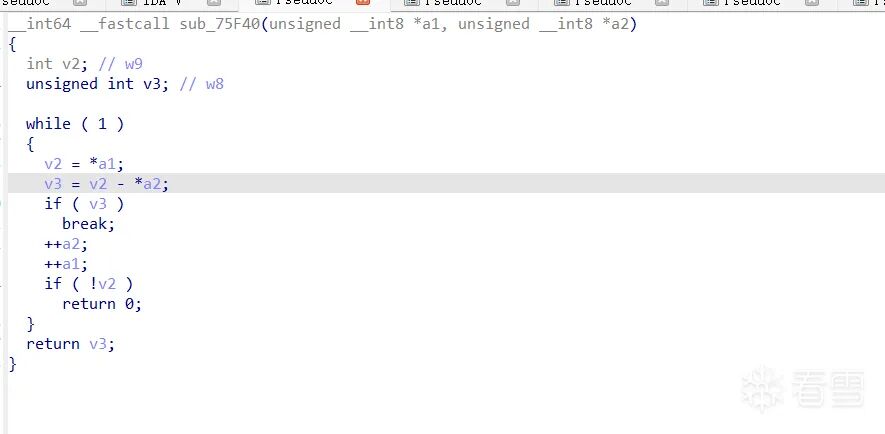 我们检查sub_75F40源码发现就是一个逐字节对比函数,检查传入的a1 和 a2 是否是相同字符,源码在上图。只要不匹配进入检测if分支,再调用sub_75F40 把一段字符串放入缓冲区v71再调用sub_75DC4进行校验,看缓冲区包不包含”:”,如果失败,跳转LABEL_52。