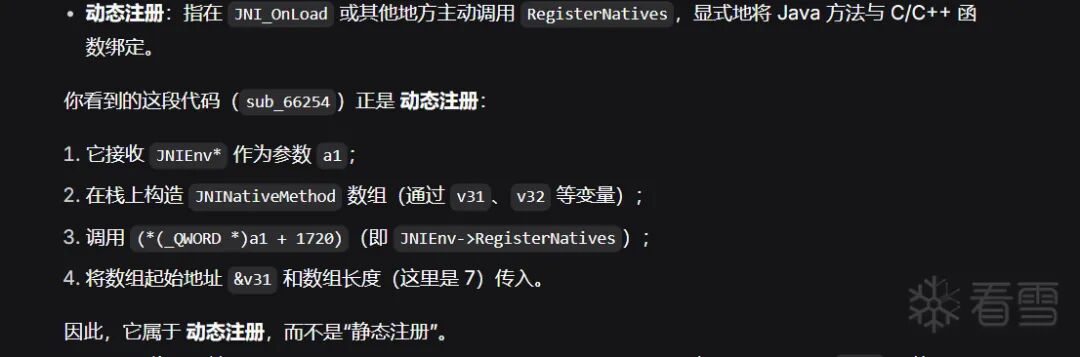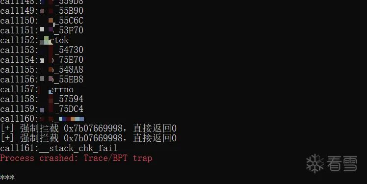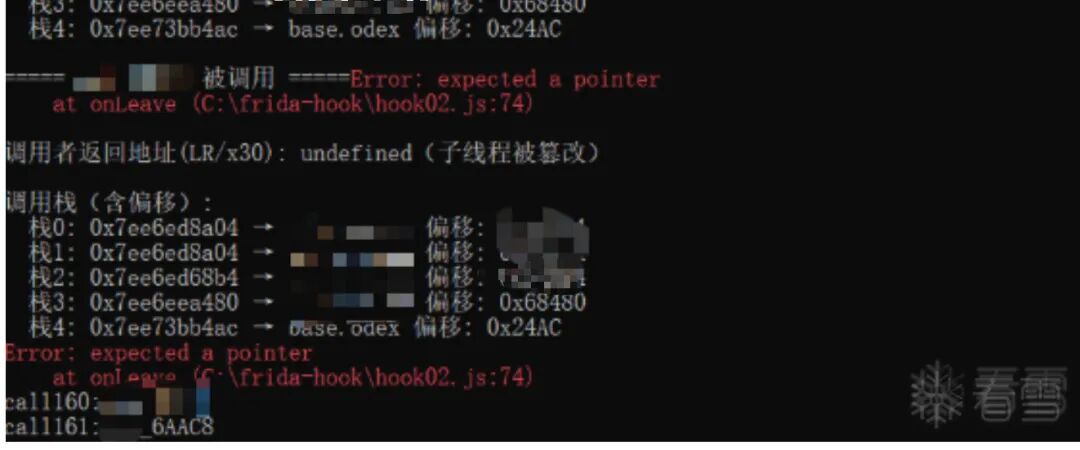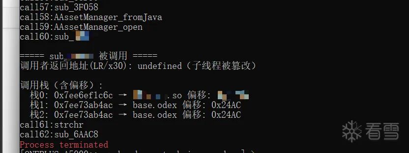 const target_so = "xxxx";var flag = false;console.log("[+] 监控启动!精准阻断加固,保留业务逻辑...");// Hook android_dlopen_ext 监控SO加载Interceptor.attach(Module.findExportByName(null, "android_dlopen_ext"), {onEnter: function (args) { this.path = args[0].readCString(); console.log("加载SO:" + this.path); if (this.path.indexOf(target_so) !== -1) { console.log("检测到目标SO加载,准备处理"); flag = true; } },onLeave: function (retval) { if (flag) { flag = false; console.log("目标SO已加载,开始精准处理加固函数"); // 获取模块基址 const moduleBase = Module.findBaseAddress(target_so); if (!moduleBase) { console.error("[-] 找不到模块基址!"); return; } console.log("[+] 模块基址:" + moduleBase); const sub_jni_Addr = moduleBase.add(""); console.log("[+] jni_onload地址:" + sub_jni_Addr); Interceptor.attach(sub_jni_Addr, {onEnter: function (args) { console.log("进来"); },onLeave: function (retval) { console.log("出去") } }) } }});// 兜底:拦截栈检查失败函数,避免崩溃Interceptor.attach(Module.findExportByName(null, "__stack_chk_fail"), {onEnter: function () { console.log("[+] 阻断栈检查失败函数__stack_chk_fail!"); this.returnValue = ptr(0); this.context.pc = this.context.lr; }});