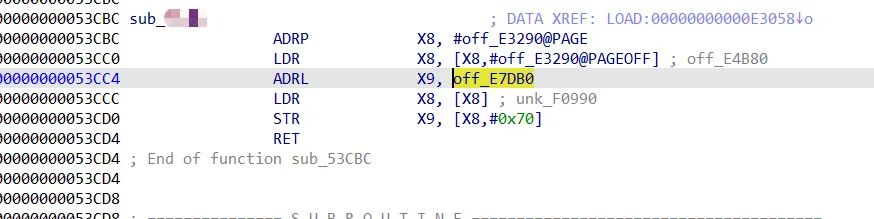 然后读取off_E5BB0的地址保存到x9,最后把x9的地址放入x8的0x40偏移处。