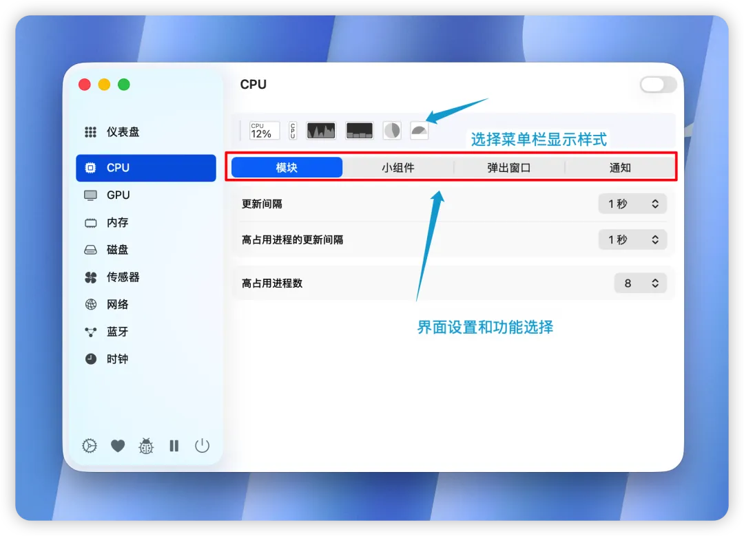 打开各个功能界面,你都可以选择菜单栏上面显示样式,模块/小组件/弹出窗口/通知里面都有单独的功能选择设置,这里就不一一介绍了。