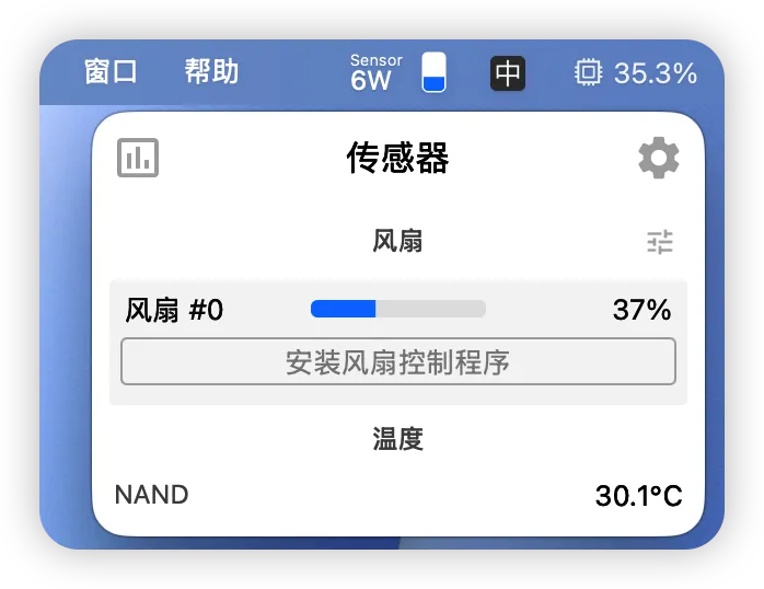 当你将传感器风扇功能放置到菜单栏上面,再在菜单栏上面点击一下传感器,就可以选择安装风扇控制程序。