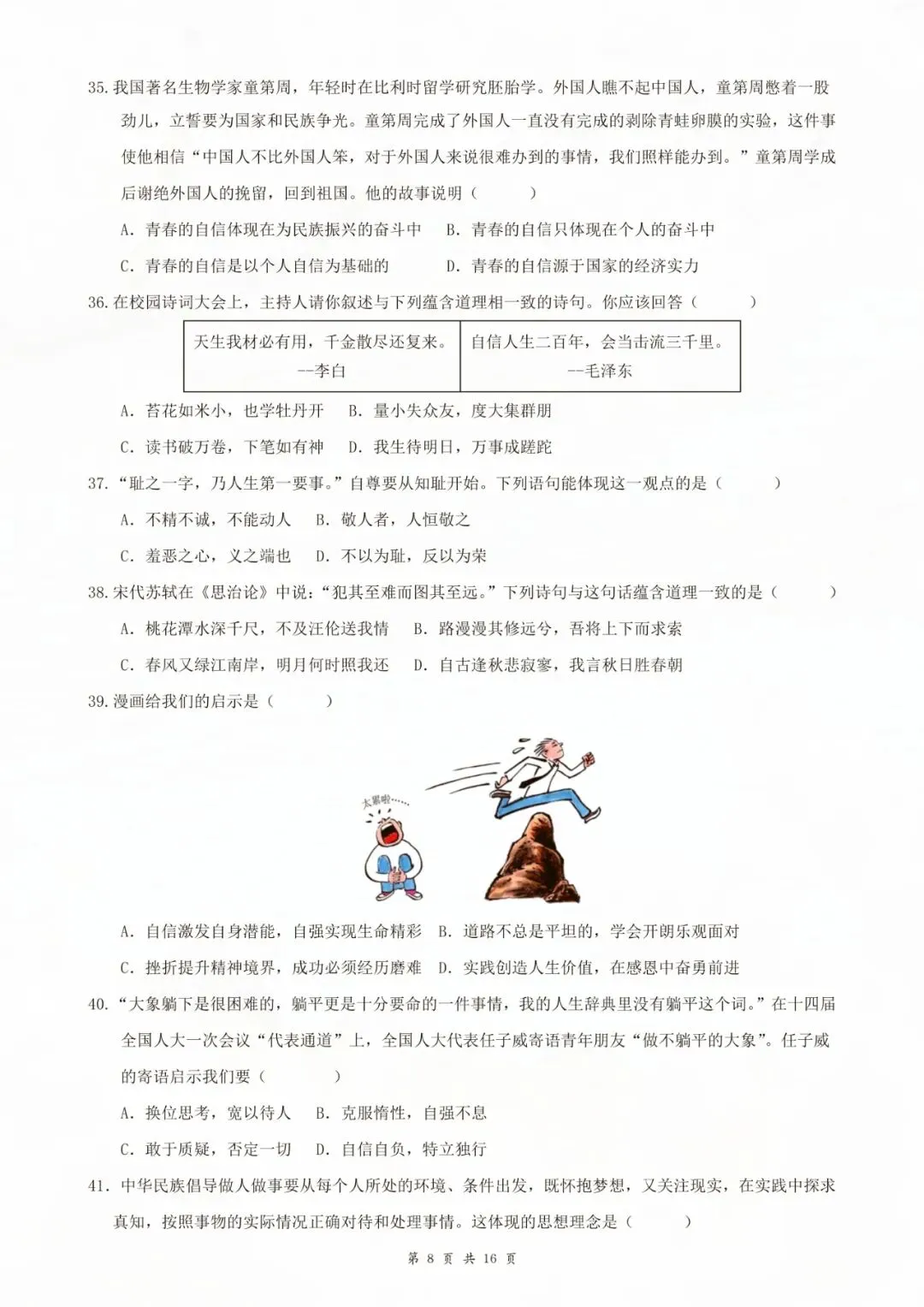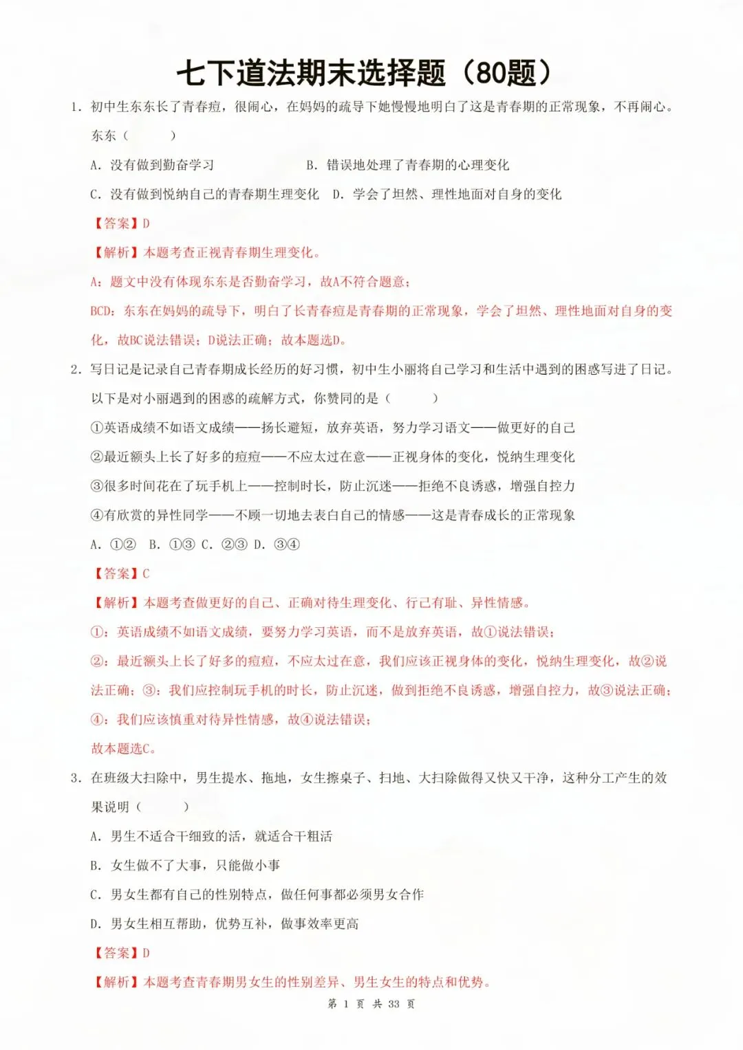 今天老师为大家全部整理好了:七年级下册道德与法治选择题 80 题原卷版 电子版可打印!