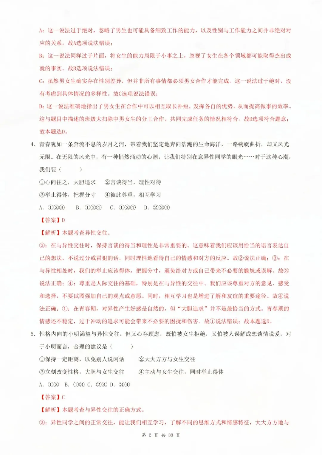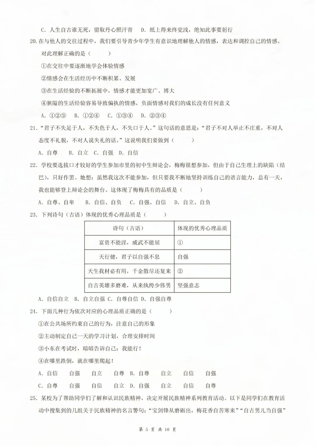 七年级下册道德与法治选择题 80 题原卷版 电子版可打印