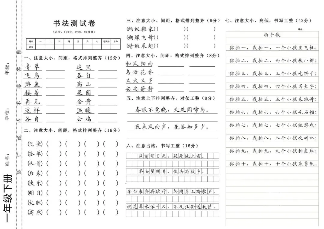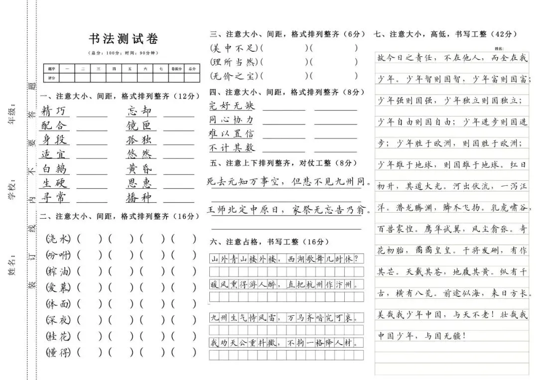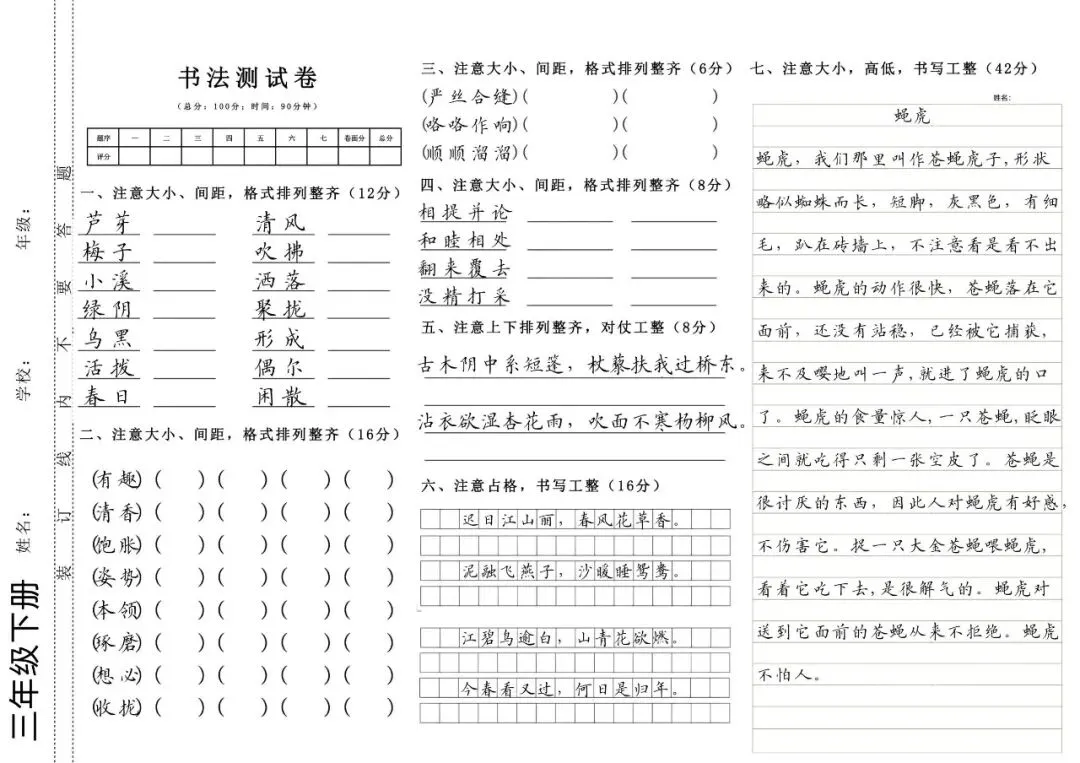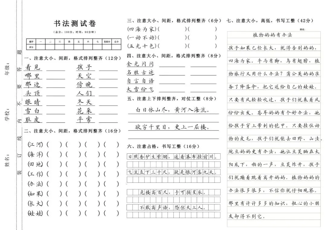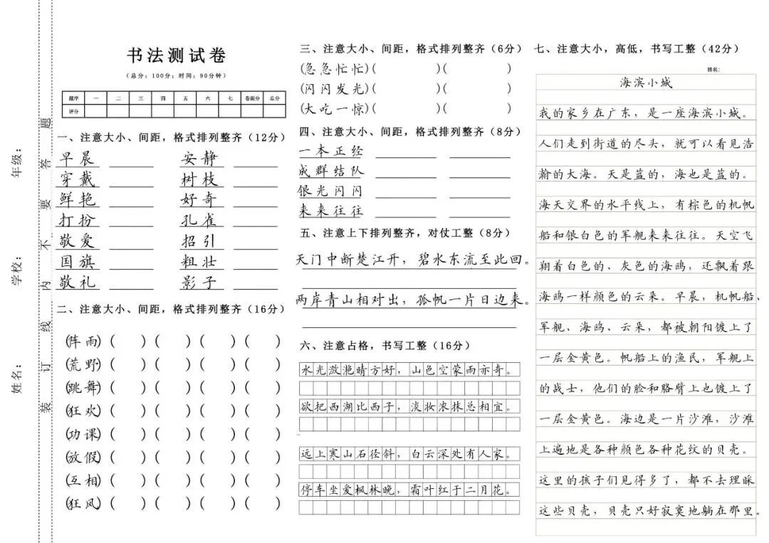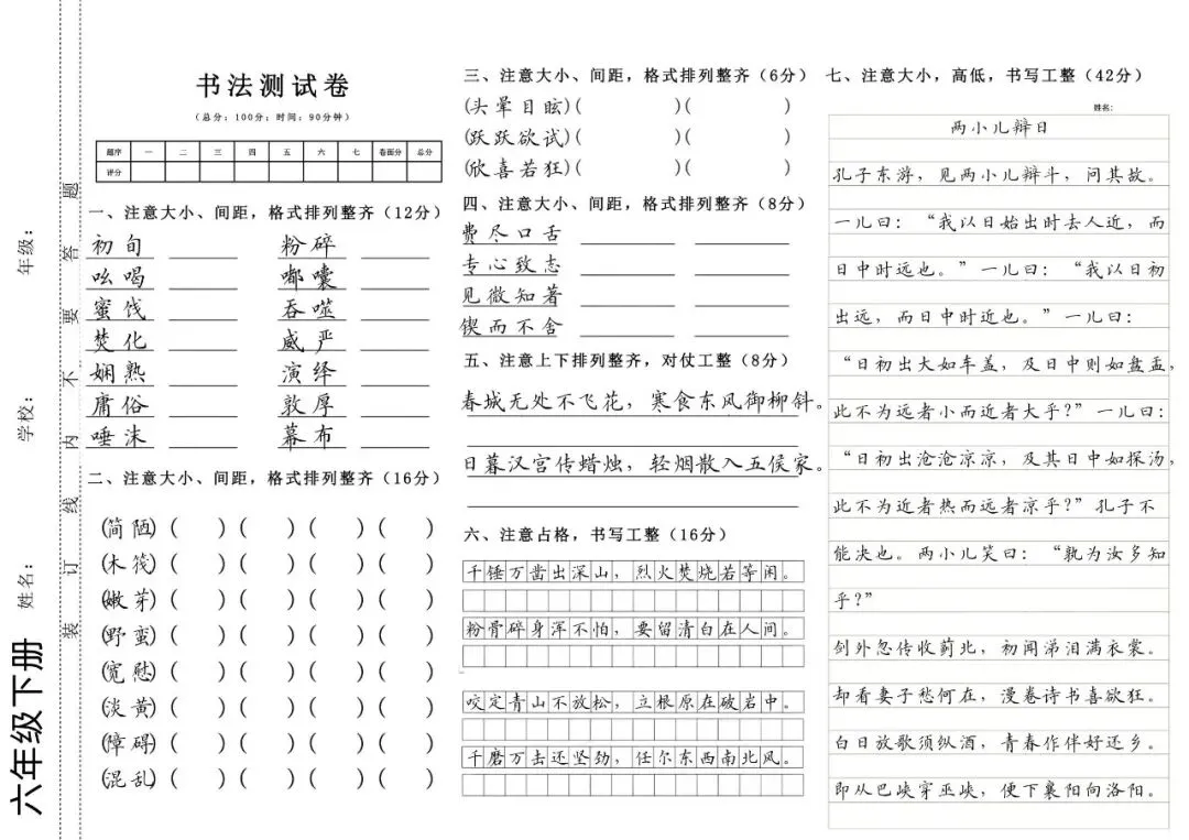 1-6年级上下册硬笔书法测试卷(字帖) 电子版可打印