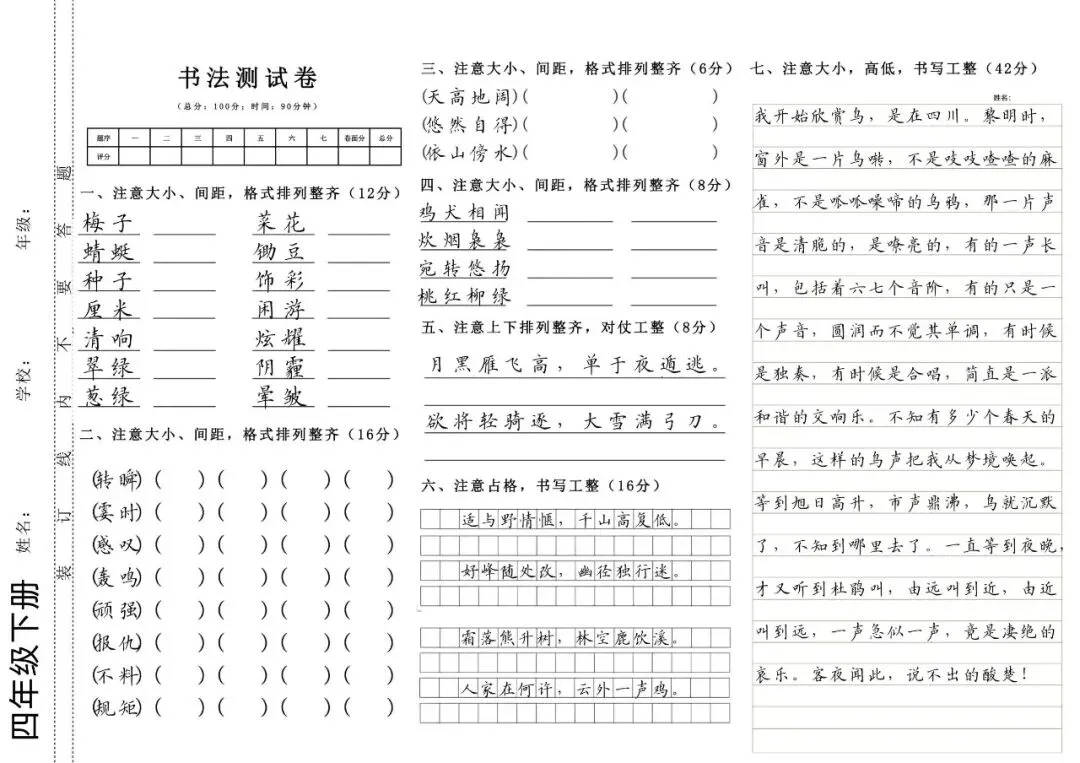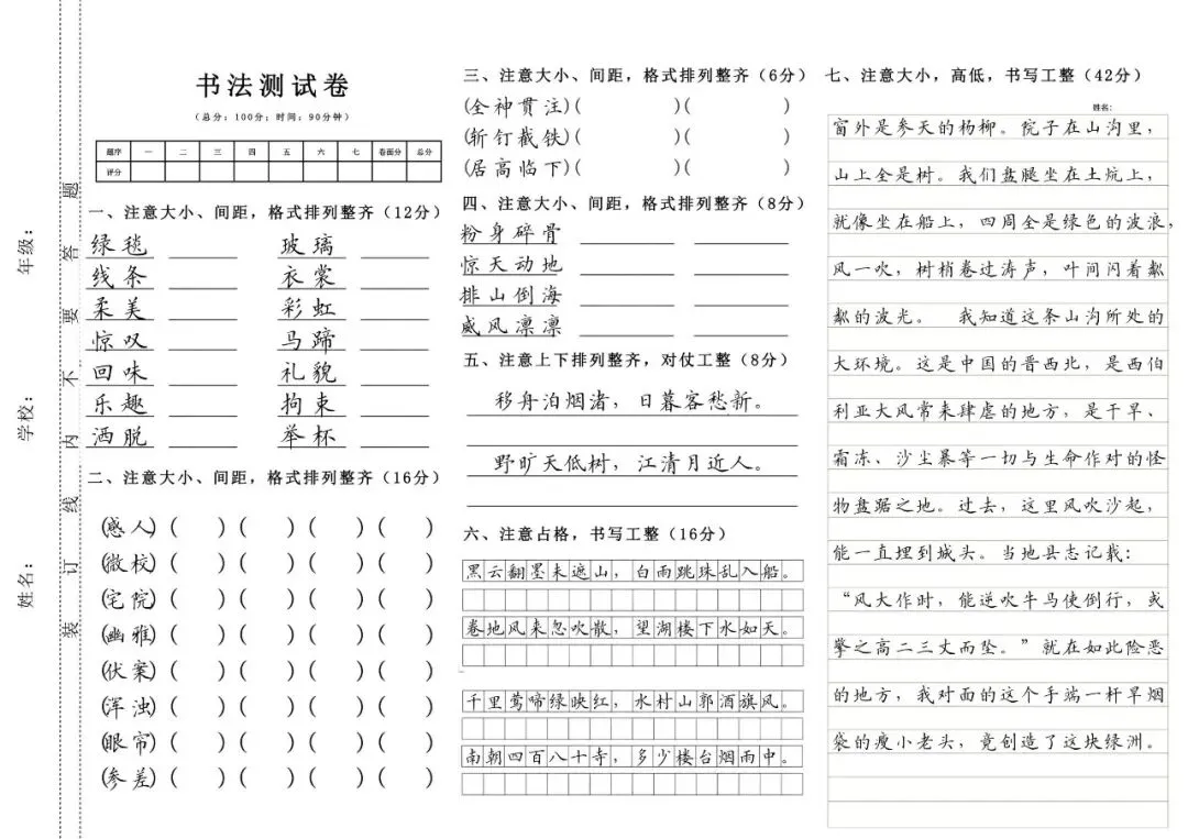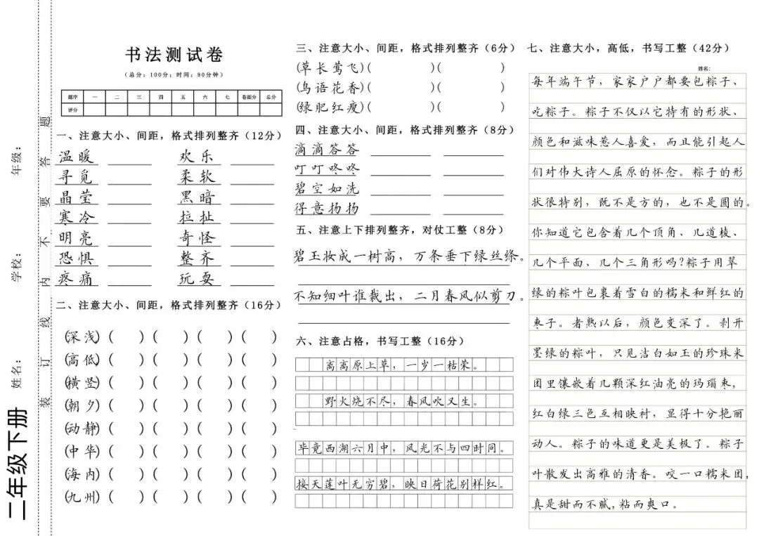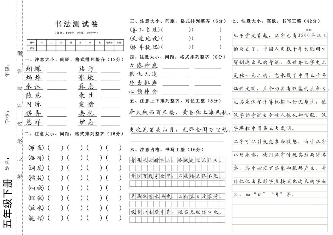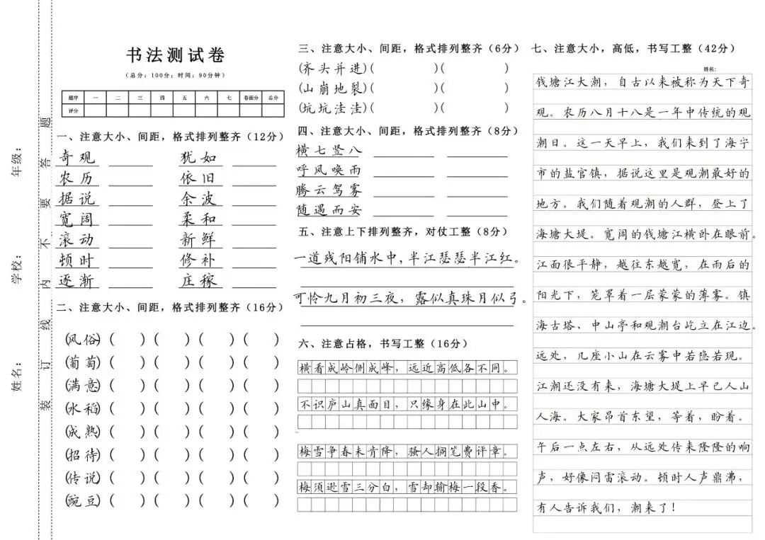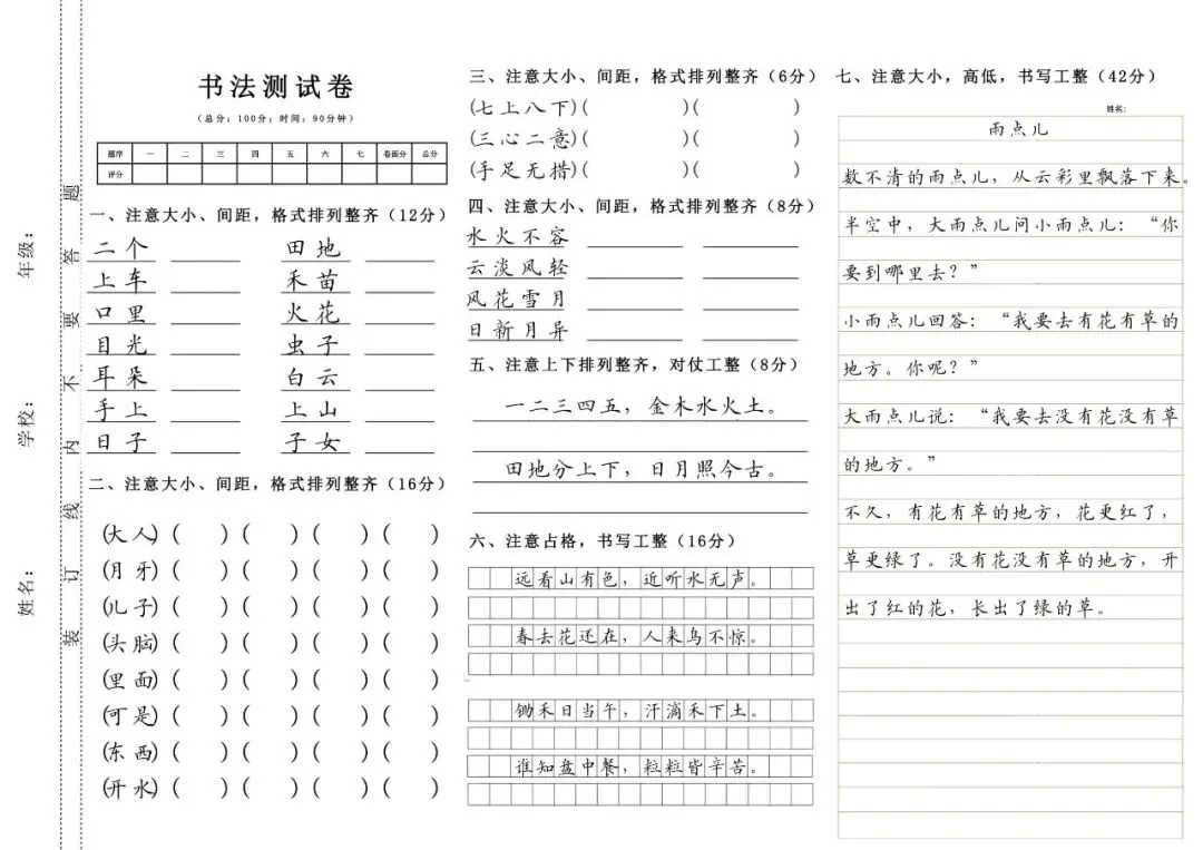 1-6年级上下册硬笔书法测试卷(字帖) 电子版可打印