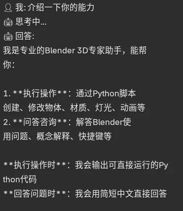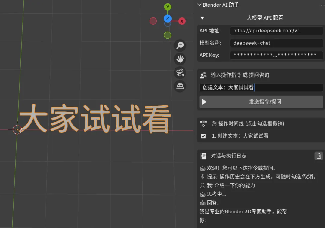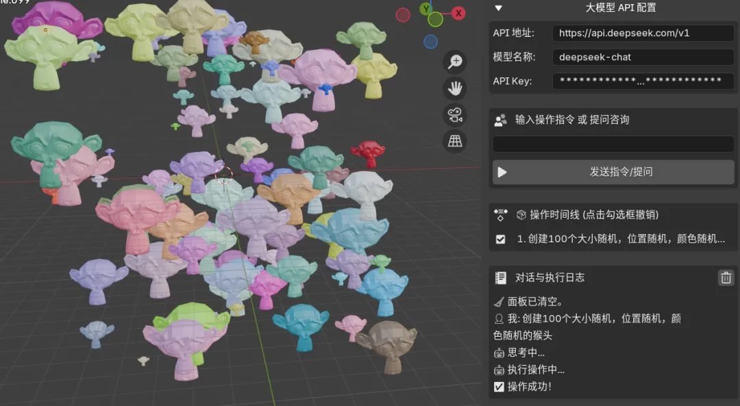 bl_info = {"name": "Blender AI 智能助手 (时光机版)","author": "匹宙","version": (7, 0, 0),"blender": (4, 0, 0),"location": "3D视图 > 侧边栏 (快捷键N) > AI助手","description": "支持智能问答、代码执行,并带有带勾选框的可视化操作历史。","warning": "","doc_url": "","category": "3D View",}import bpyimport jsonimport urllib.requestimport threadingimport sysimport ioimport reimport traceback# --- 全局状态与日志管理 ---class ConsoleState:is_processing = Falselogs = ["🤖 欢迎!您可以下达指令或提问。","💡 提示: 操作历史会在下方生成,可随时勾选/取消。"]state = ConsoleState()def wrap_text_for_blender(text, max_chars=22):wrapped_lines = []for paragraph in str(text).split('\n'):if not paragraph.strip():wrapped_lines.append("")continuewhile len(paragraph) > max_chars:wrapped_lines.append(paragraph[:max_chars])paragraph = paragraph[max_chars:]wrapped_lines.append(paragraph)return wrapped_linesdef print_to_console(text, prefix=""):lines = wrap_text_for_blender(text)for line in lines:state.logs.append(prefix + line)if len(state.logs) > 30:state.logs = state.logs[-30:]# --- 数据结构: AI 历史记录项 ---class AIHistoryItem(bpy.types.PropertyGroup):prompt: bpy.props.StringProperty(name="指令")is_active: bpy.props.BoolProperty(name="生效状态", default=True)# --- 核心通信功能 ---def call_llm_async(system_prompt, user_prompt, context, callback):api_key = context.scene.ai_api_keybase_url = context.scene.ai_base_urlmodel_name = context.scene.ai_model_nameif not api_key:callback(None, "ERROR: 请先展开上方配置,填写 API Key!")returndef task():try:url = base_url.rstrip("/") + "/chat/completions"payload = {"model": model_name,"messages": [{"role": "system", "content": system_prompt},{"role": "user", "content": user_prompt}],"temperature": 0.1}data = json.dumps(payload).encode('utf-8')headers = {'Content-Type': 'application/json','Authorization': f'Bearer {api_key}'}req = urllib.request.Request(url, data=data, headers=headers)with urllib.request.urlopen(req, timeout=40) as response:result = json.loads(response.read().decode('utf-8'))reply_text = result["choices"][0]["message"]["content"]match = re.search(r'```(?:python)?\s*(.*?)\s*```', reply_text, re.DOTALL | re.IGNORECASE)if match:code = match.group(1).strip()bpy.app.timers.register(lambda: callback(code, None) or None)else:bpy.app.timers.register(lambda: callback(None, reply_text.strip()) or None)except Exception as e:bpy.app.timers.register(lambda: callback(None, f"ERROR: 网络错误 - {str(e)}") or None)thread = threading.Thread(target=task)thread.daemon = Truethread.start()# --- 算子 (Operators) ---class BLENDER_AI_OT_execute(bpy.types.Operator):"""执行 AI 指令或回答问题"""bl_idname = "blender_ai.execute_code"bl_label = "发送 (回车)"def execute(self, context):scene = context.sceneprompt = scene.ai_promptif not prompt:return {'CANCELLED'}state.is_processing = Trueprint_to_console(f"👤 我: {prompt}")print_to_console("🤖 思考中...")active_obj = context.active_object.name if context.active_object else "无"current_mode = context.modesystem_prompt = f"""你是一个专业的 Blender 3D 专家助手。【情况 1:执行操作】如要求创建、修改物体、材质等,请只输出可放入 exec() 运行的 Python 脚本,用 ```python 包裹。包含 import bpy。【情况 2:问答咨询】如提问快捷键、概念等,直接用简短纯中文回答,不要输出代码。[当前状态] 模式: {current_mode}, 选中: {active_obj}"""def handle_response(code, chat_reply):state.is_processing = Falseif chat_reply:if chat_reply.startswith("ERROR:"):print_to_console(f"❌ {chat_reply}")else:print_to_console("🤖 回答:")print_to_console(chat_reply)scene.ai_prompt = ""returnif code:# 核心逻辑:如果在历史中间插入新操作,需清除后面的撤销记录if scene.ai_history_index < len(scene.ai_history) - 1:# 删除当前指针之后的所有历史记录for _ in range(len(scene.ai_history) - 1, scene.ai_history_index, -1):scene.ai_history.remove(len(scene.ai_history) - 1)print_to_console("🤖 执行操作中...")old_stdout = sys.stdoutredirected_output = io.StringIO()sys.stdout = redirected_outputtry:# 执行代码前推入历史节点bpy.ops.ed.undo_push(message=f"AI 之前状态")exec(code, globals(), locals())bpy.ops.ed.undo_push(message=f"AI: {prompt}")# 记录到自定义的时间线列表new_item = scene.ai_history.add()new_item.prompt = promptnew_item.is_active = Truescene.ai_history_index = len(scene.ai_history) - 1print_to_console("✅ 操作成功!")scene.ai_prompt = ""except Exception as e:exc_type, exc_value, exc_traceback = sys.exc_info()tb_lines = traceback.format_exception(exc_type, exc_value, exc_traceback)print_to_console(f"❌ 报错:\n{''.join(tb_lines[-2:]).strip()}")finally:sys.stdout = old_stdoutcall_llm_async(system_prompt, prompt, context, callback=handle_response)return {'FINISHED'}class BLENDER_AI_OT_toggle_history(bpy.types.Operator):"""时光机:通过勾选框撤销或重做操作"""bl_idname = "blender_ai.toggle_history"bl_label = "切换历史状态"target_idx: bpy.props.IntProperty()def execute(self, context):scene = context.scenehistory = scene.ai_historycurrent_idx = scene.ai_history_indextarget_idx = self.target_idxtarget_item = history[target_idx]is_currently_active = target_item.is_active# 如果取消勾选当前项,意味着我们要回到当前项的【前一步】# 如果勾选当前项,意味着我们要来到【当前项】desired_state_idx = target_idx - 1 if is_currently_active else target_idx# 时光穿梭逻辑:调用原生的 Undo / Redoif desired_state_idx < current_idx:# 需要后退 (撤销)steps = current_idx - desired_state_idxfor _ in range(steps):bpy.ops.ed.undo()elif desired_state_idx > current_idx:# 需要前进 (重做)steps = desired_state_idx - current_idxfor _ in range(steps):bpy.ops.ed.redo()# 更新历史列表的 UI 显示状态scene.ai_history_index = desired_