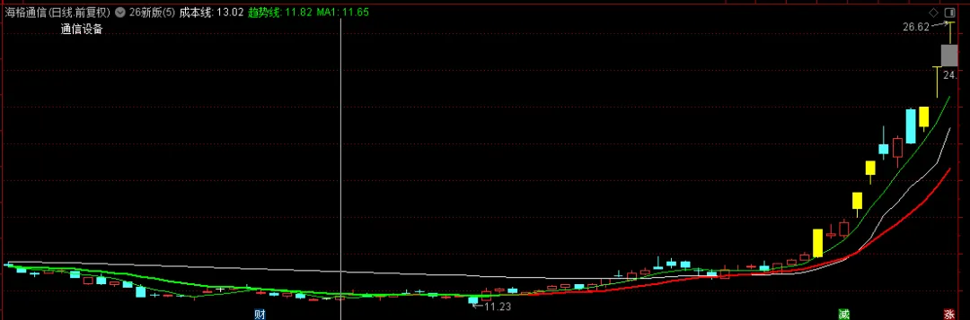 成本线:IF(JJJT,DMA(AMOUNT/(100*VOL),100*VOL/FINANCE(7)),EMA((HIGH+LOW+CLOSE)/3,120));