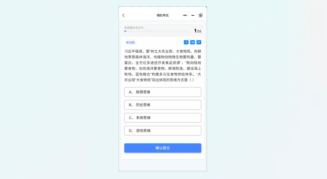 每套真题显示题目总数(如”客观题共33题”);