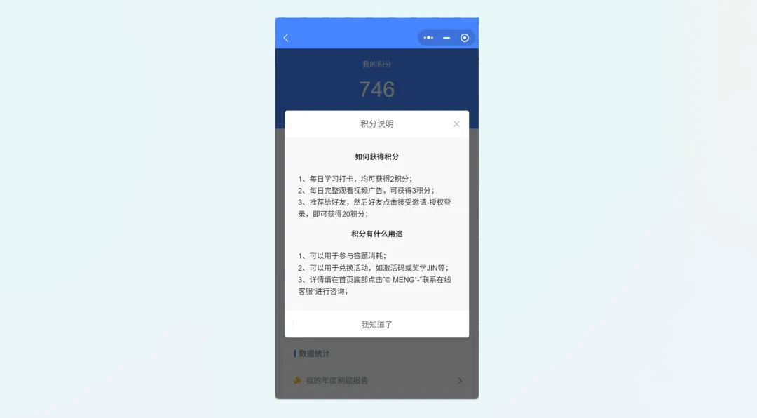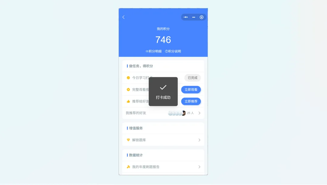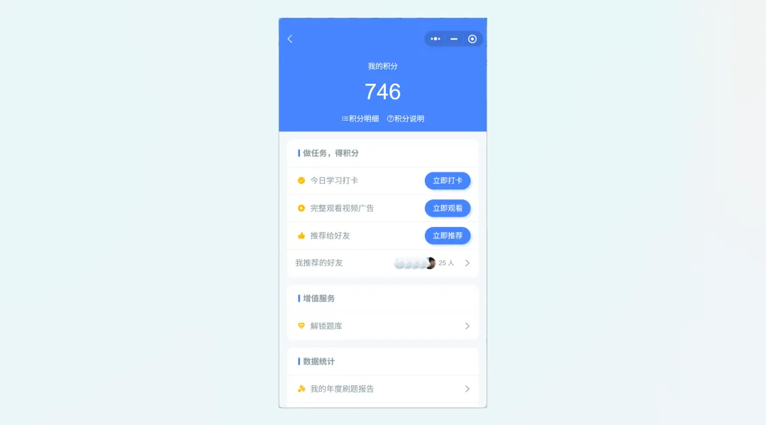 差异化优势:积分激励体系 + 完整学习闭环 + 历年真题库;