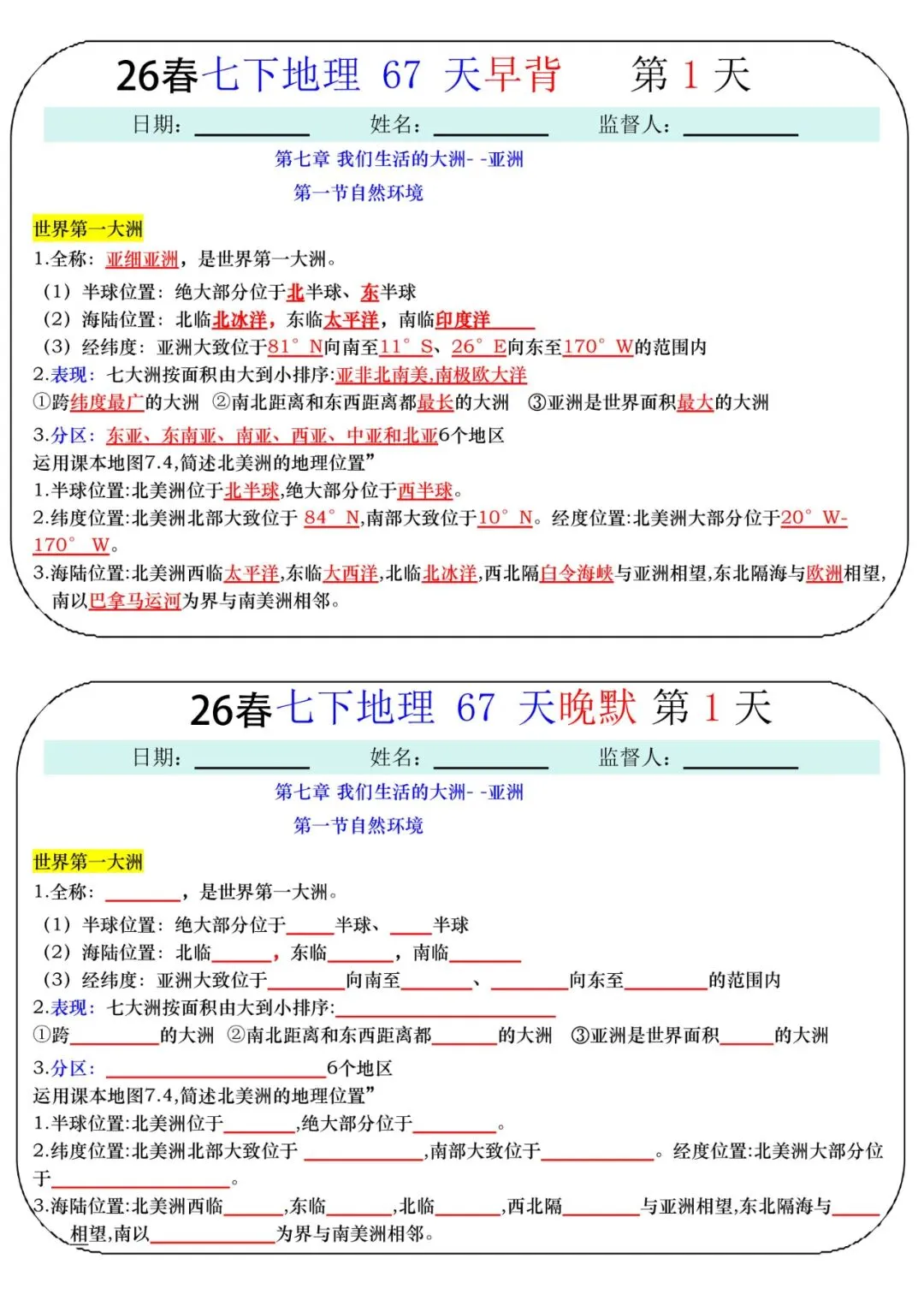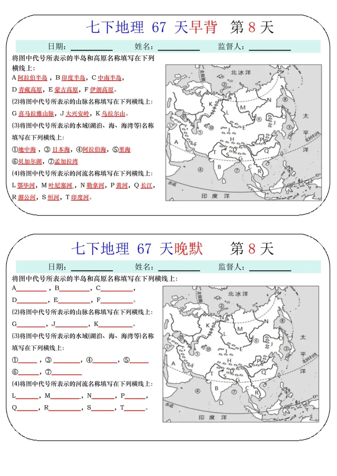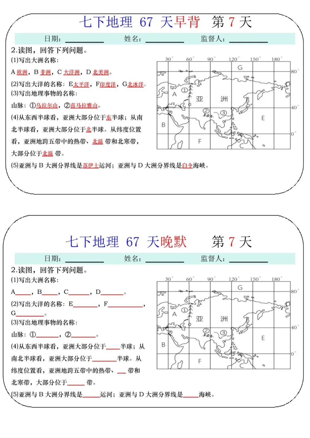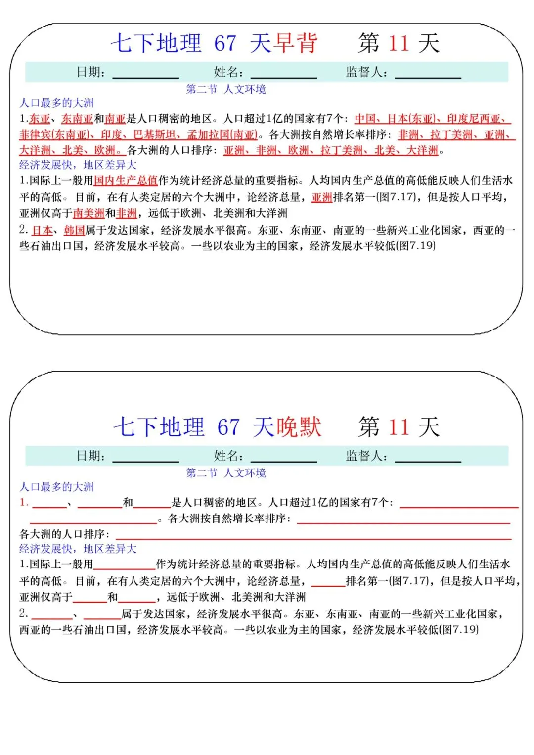 今天老师为同学们整理了相关内容:七年级下册地理早背晚默 67 天核心考点电子版可打印