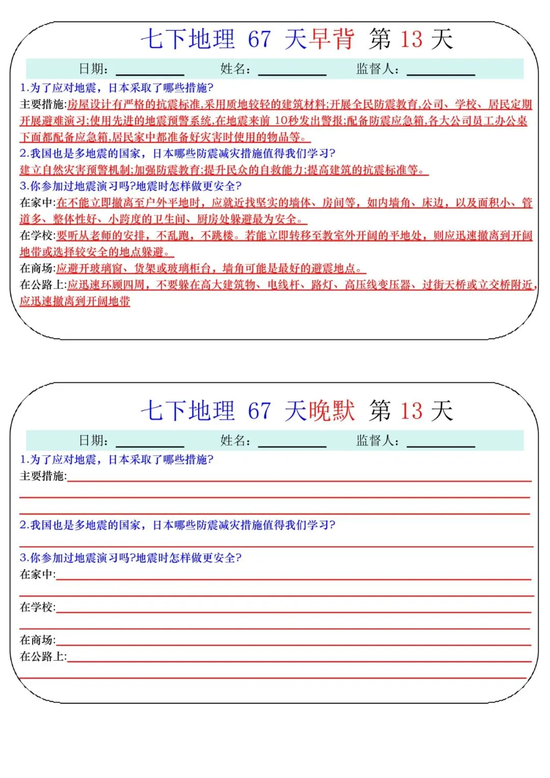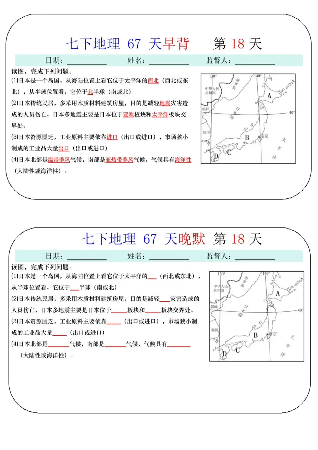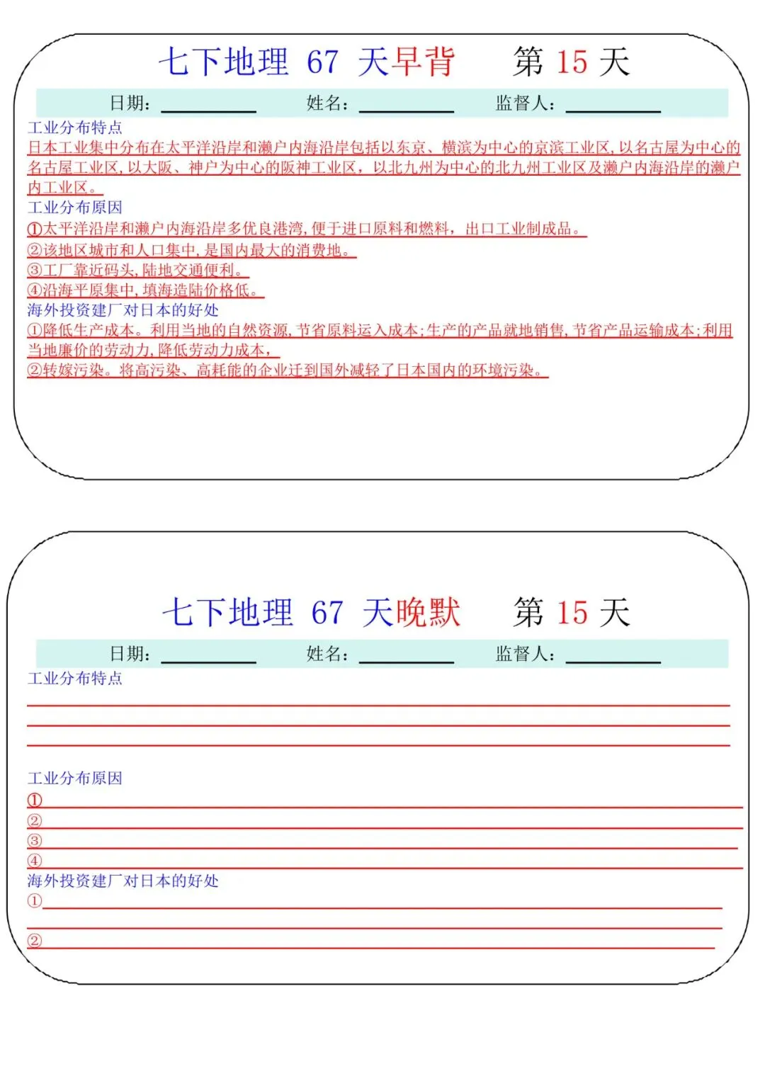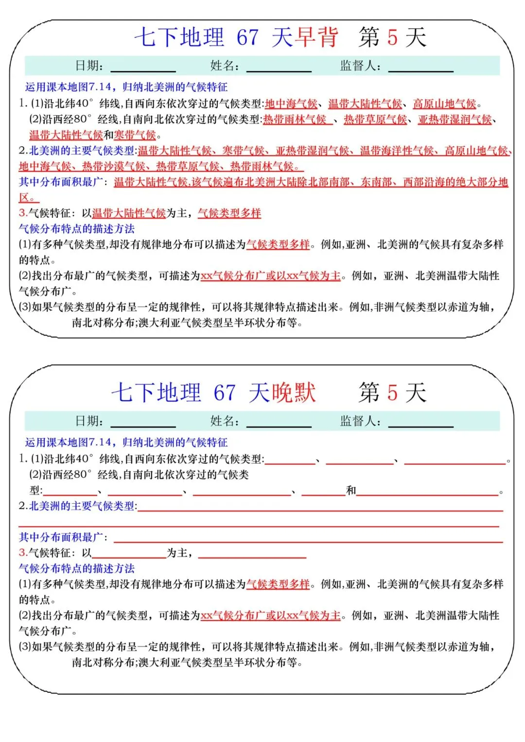 今天老师为同学们整理了相关内容:七年级下册地理早背晚默 67 天核心考点电子版可打印