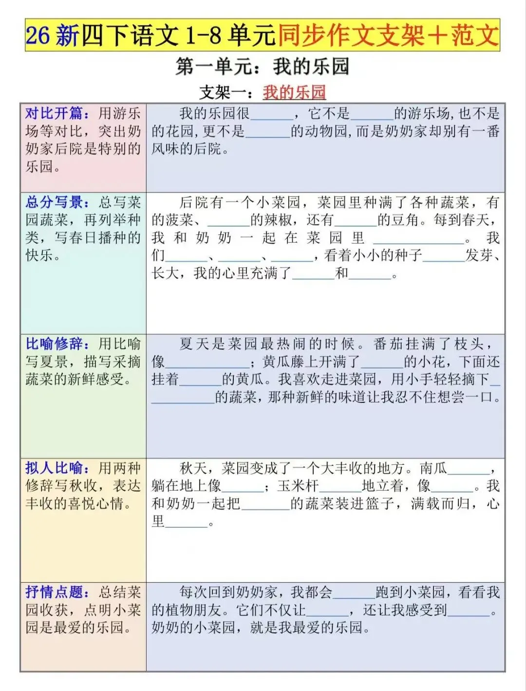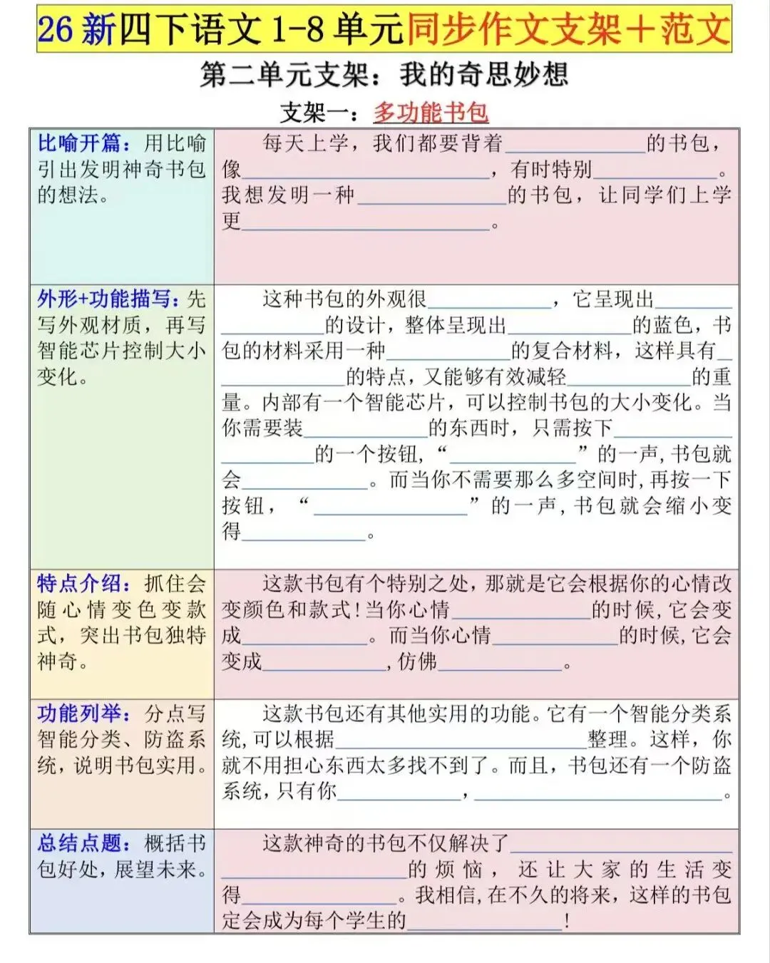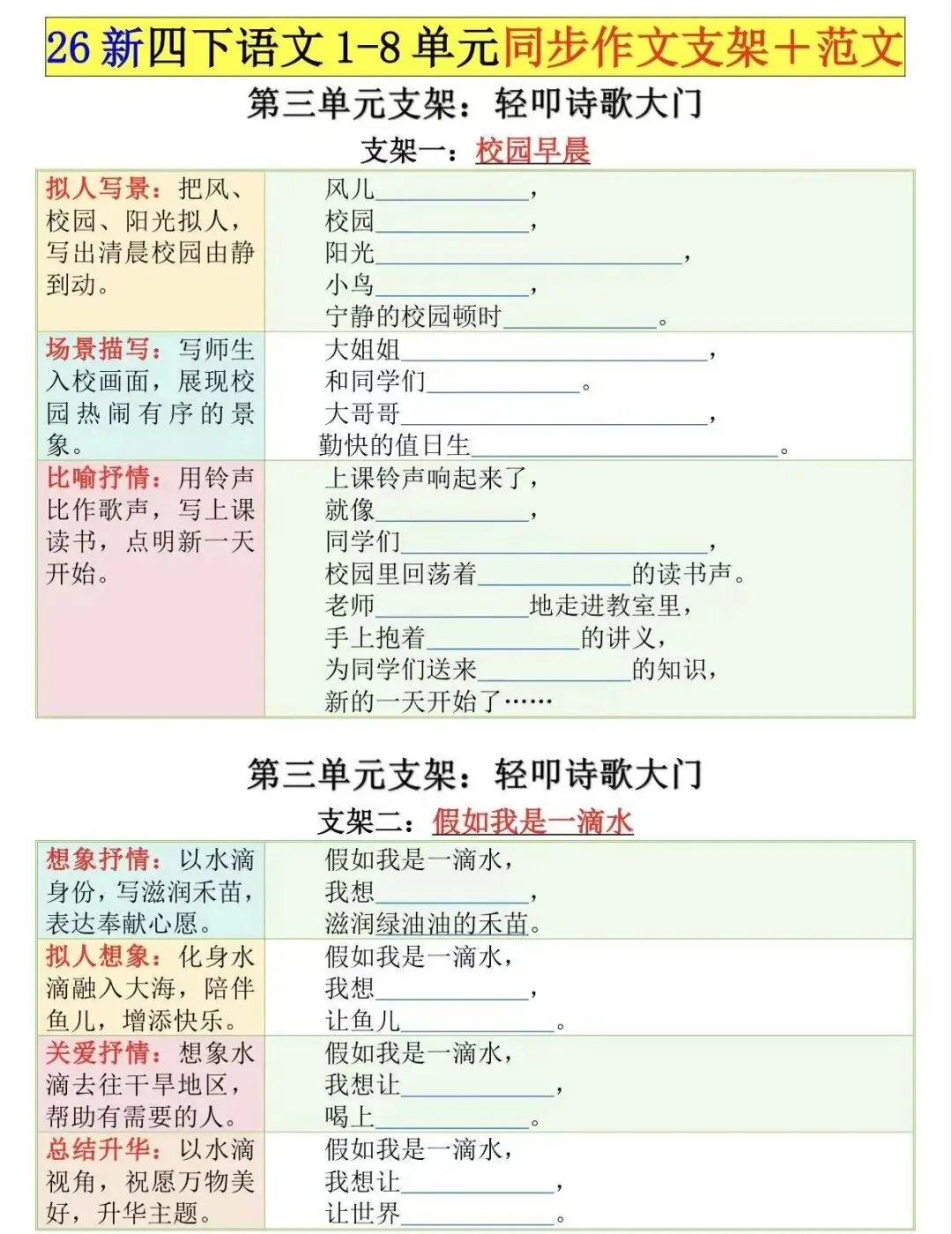 大家好我是提优补差;今天跟大家分享的是;2026年春新版人教部编版四年级下册语文《1-8单元习作作文支架+优秀范文》,提供电子版,支持打印和下载。