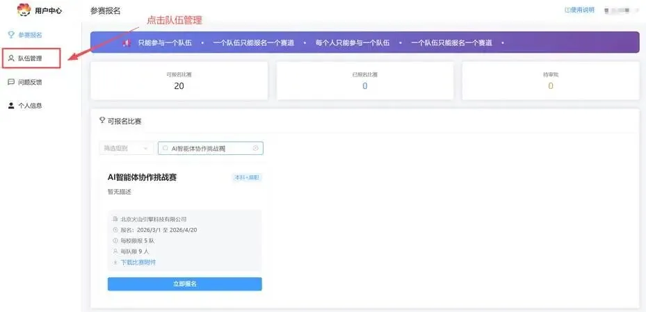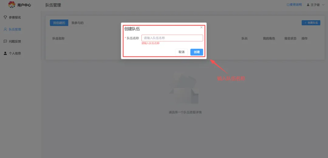 进入页面后点击右上方【创建队伍】,创建队伍后此页面可查看队伍信息。