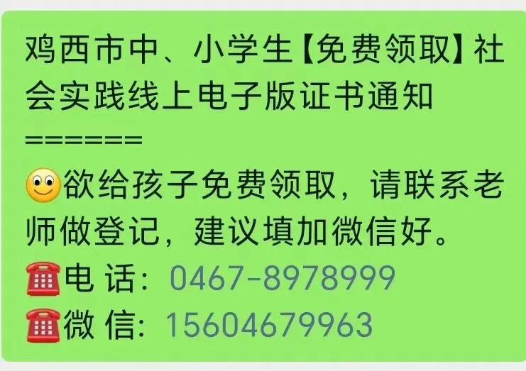 鸡西市中、小学生【免费领取】社会实践线上电子版证书通知
