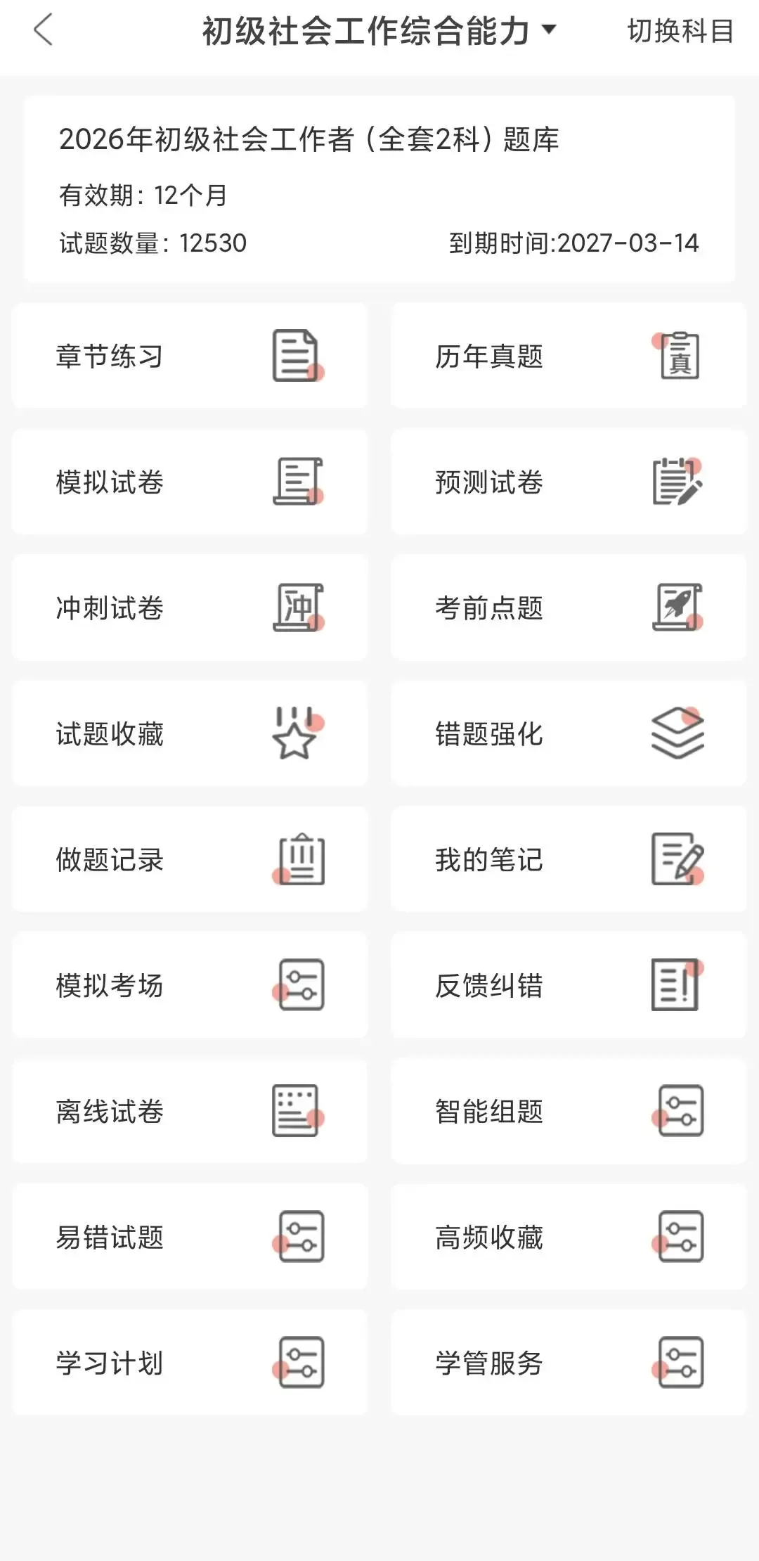 这款题库覆盖初级、中级全科目,精准匹配2026年新大纲,6大核心题库按需切换,适配备考全阶段。