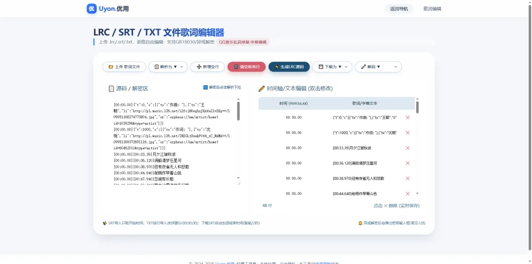 一款专为解决歌词乱码而生的可视化编辑器。支持上传.lrc/.srt/.txt等 文件,将歌词解析为“时间+文本”表格,可自由增删行、修改时间轴。内置 GB18030解码 与 异或解密,一键修复QQ音乐等平台常见的加密或编码错误。所有操作均在本地完成,安全无上传。