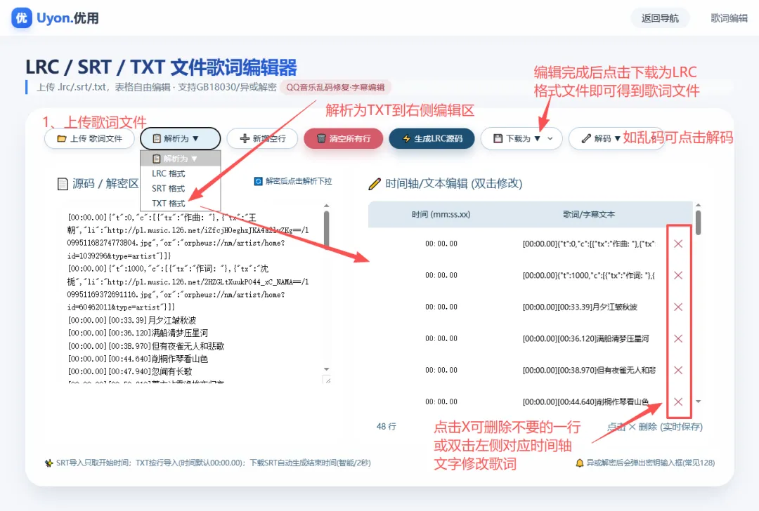 编辑歌词:双击表格单元格修改时间或文本,点击行尾 ✕ 删除该行,或通过「新增空行」添加空白行。