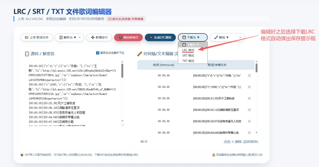 生成源码:编辑完成后点击「生成源码」,上方文本框更新为标准LRC格式。
